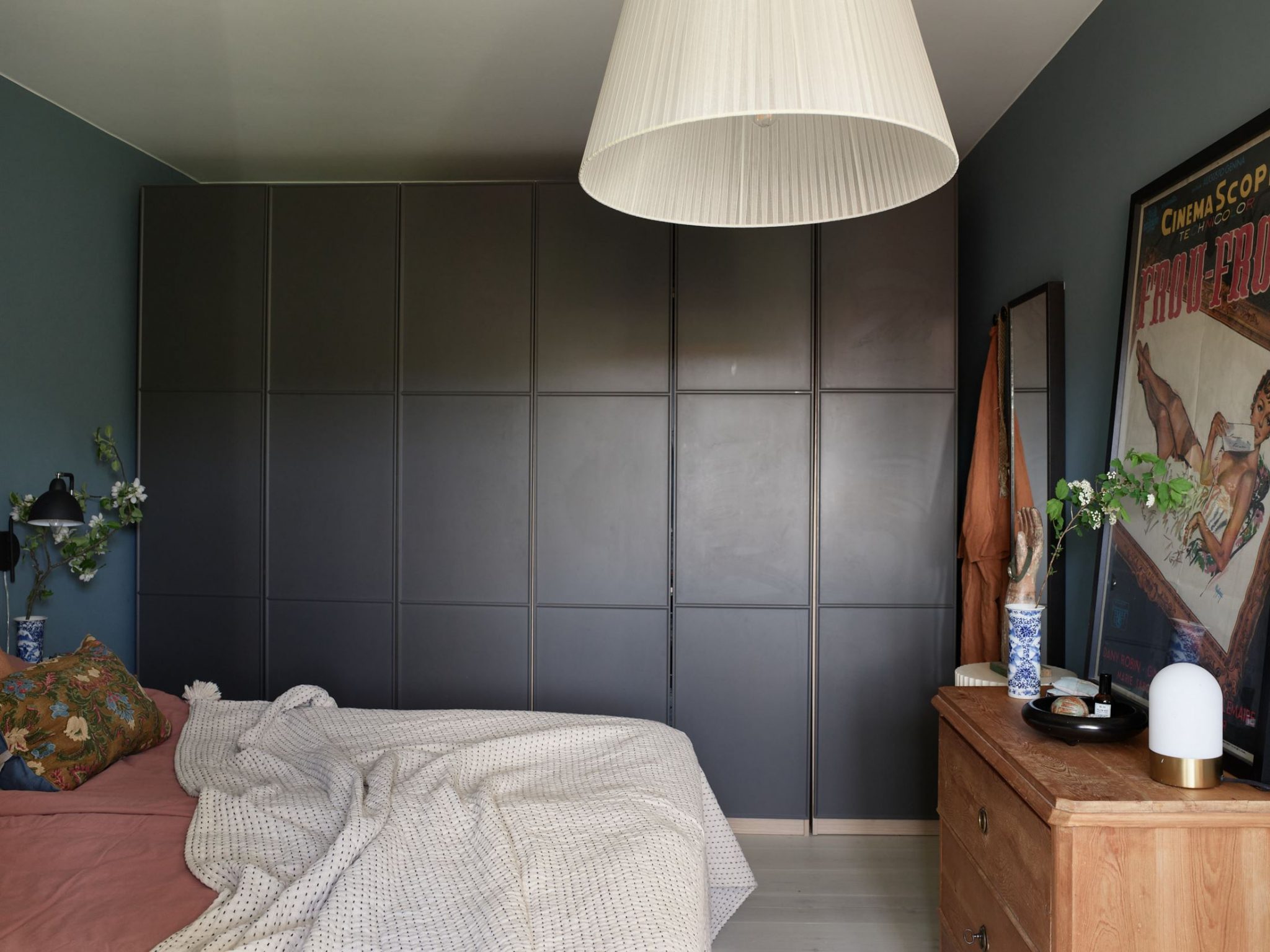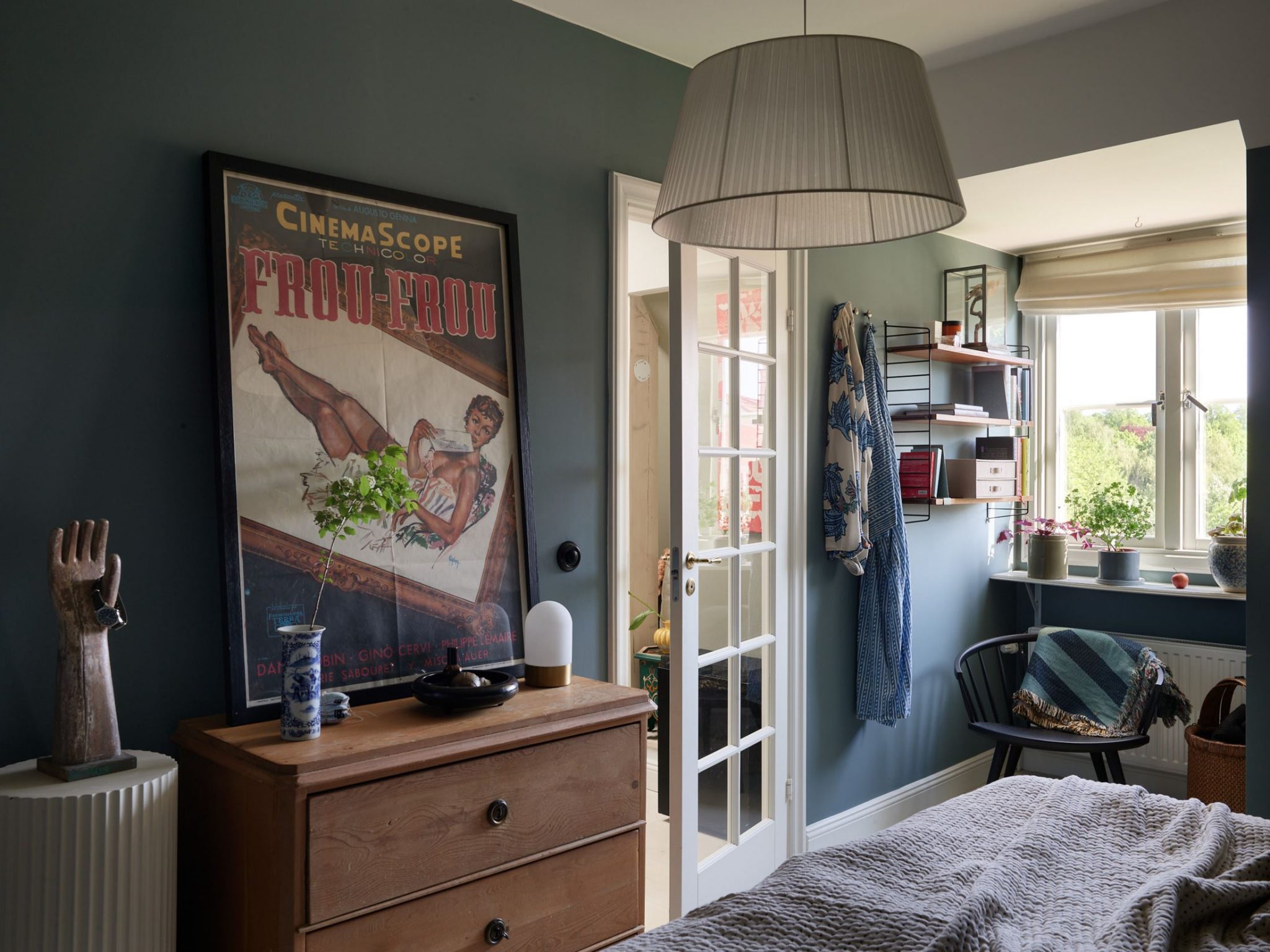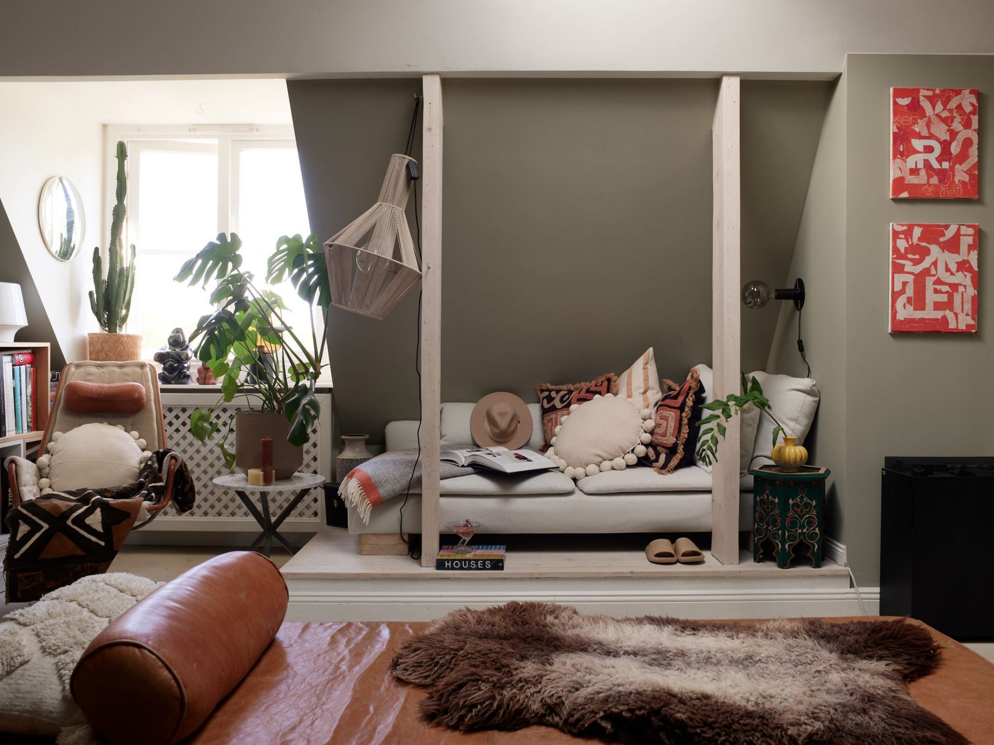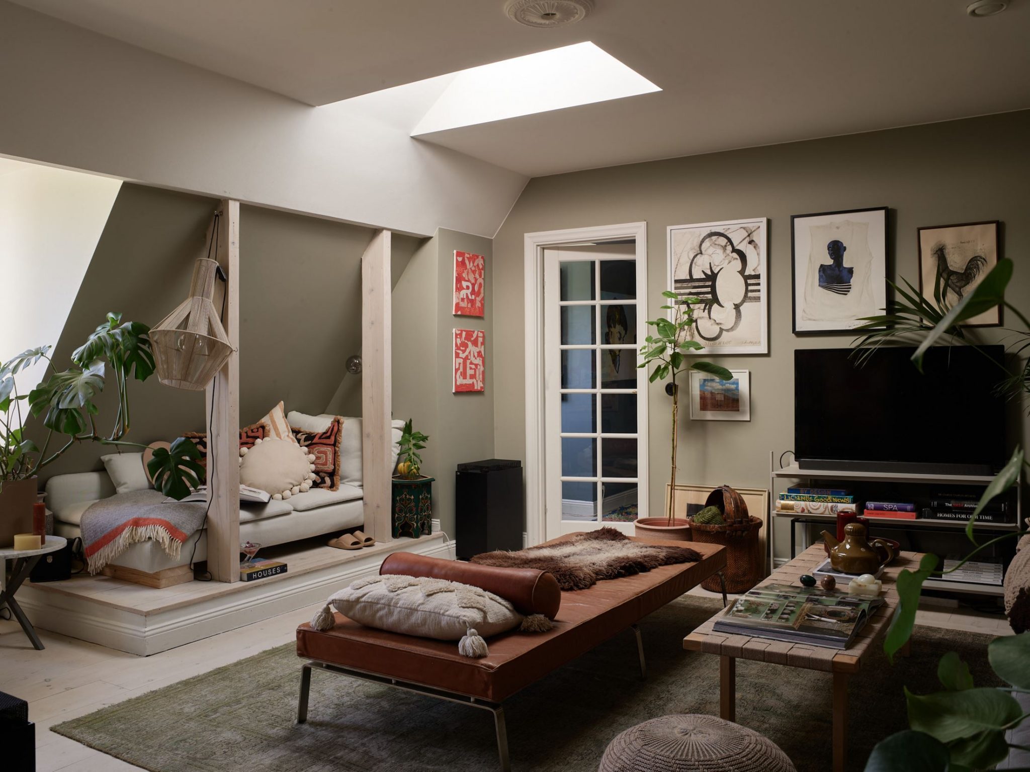 Des couleurs fortes habillent ce charmant appartement vintage. Bien que sa décoration soit assez sombre, il reste lumineux . Les volumes mansardés lui donnent une allure atypique, car il est installé dans un ancien grenier qui a conservé une partie de ses poutres. Celles-ci délimitent des zones, comme dans le salon où un lit d’appoint a été installé dans un coin.