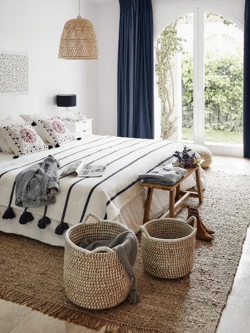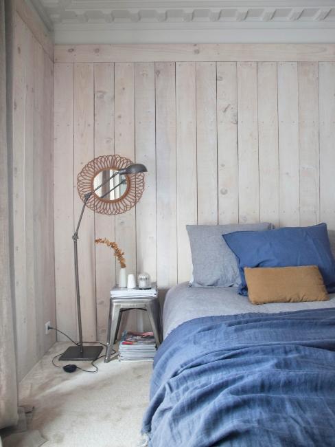 - Pour le côté bord de mer, tournez vous vers des matériaux naturels plutôt clair. Laissez les poutres apparentes et peignez-les en blanc si elles vous semblent alourdir votre chambre, même chose pour le lambris qui gagnera alors en modernité. Pensez au bois, des lames de bois ou même d’anciens volets (patinés ou non) pour confectionner votre tête de lit ; du flotté, par exemple pour un pied de lampe, un portemanteau, utilisez de la ficelle pour suspendre un macramé, des vases en verre, dérouler un tapis en coton, en jute, en jonc…