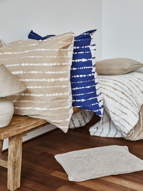 - Un bleu marine profond avec du beige, utilisé pour du linge de lit restera classique.Surtout si la chambre demeure sobre, habillée de teintes et matériaux naturels et discrets (table de nuit en bois, voilage craie)… Noter que le blanc apportera d’avantage de luminosité. Le contraste avec un bleu dur peut être intéressant, mais assurez-vous que l’espace n’en devienne pas éblouissant. Si la chambre profite de beaucoup de lumière, optez pour une peinture blanc-cassé au mur. A l’inverse, si elle est plutôt sombre, tournez-vous vers un blanc éclatant aux murs et même au sol.