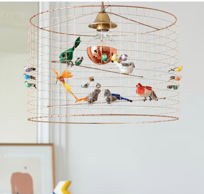 La suspension Petite Volière est un luminaire original à la fois poétique et moderne. Cette suspension design présentent de faux oiseaux en vraies plumes prenant vie dans un abat-jour métallique en grillage cuivré. chez The Cool Républic Les Volières de Mathieu Challières