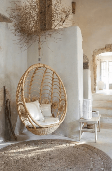 Pour compléter votre espace détente extérieur d’une pièce phare, rien de tel que le fauteuil suspendu extérieur Boayana – Fauteuil suspendu extérieur en résine imitation rotin et coussin écru Maisons du Monde 359,00 €