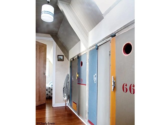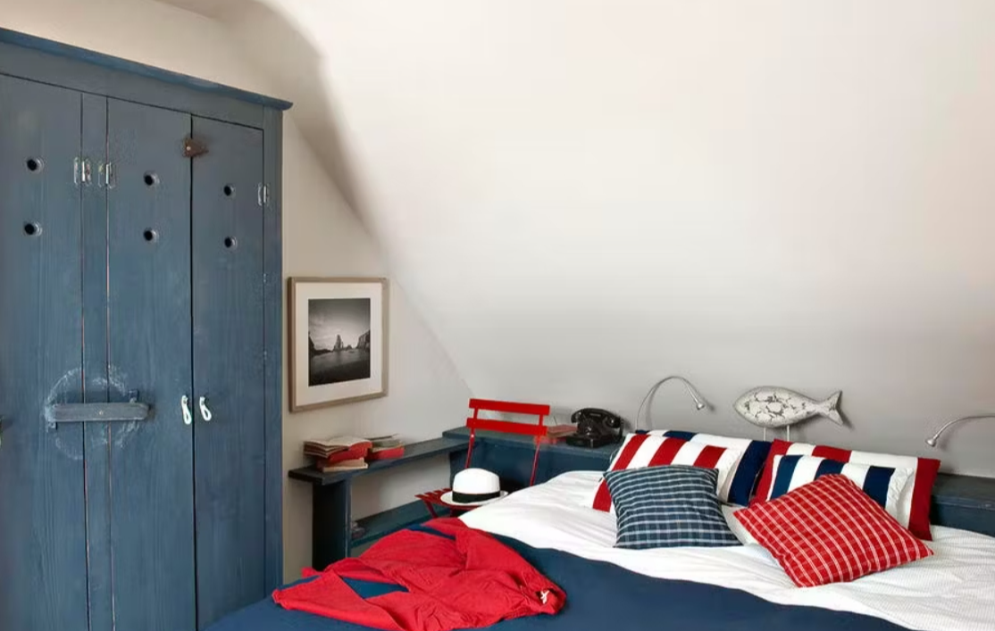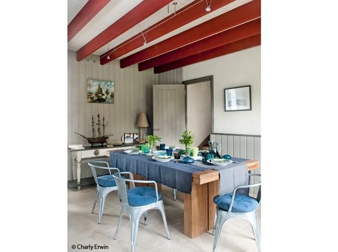En Bretagne, les maisons sont souvent décorées selon l’esprit bord de mer : bois flotté, couleurs claires, voiles de bateau recyclées et objets de marine, grandes fenêtres avec vue sur la plage ou la campagne. Qu’elles soient traditionnelles ou contemporaines, ces maisons bretonnes sont accueillantes et originales. Découvrez aussi des maisons d’hôtes et des gîtes qui fourmillent d’idées déco bord de mer et inspirez-vous de ces lieux pour aménager votre intérieur et lui donner un air de vacances toute l’année. Cap sur une maison de style marin de à Belle-Ile-en-Mer ! La propriétaire en a confié l’aménagement à Yvan Desautel, artiste de la région. Celui-ci a pris le parti d’une décoration bord de mer, allant jusqu’à fabriquer lui-même des meubles et des rangements, comme les placards jaunes de la cuisine dotés de petits hublots pour parfaire le style marin du lieu. Les couleurs – rouge, bleu, jaune et blanc –, les matières comme les cordes les filins, le bois flotté, les objets avec des poissons et des oiseaux décoratifs, des lettrages rappelant les inscriptions figurant sur les bateaux, tous les codes d’un style marin… surtout à Belle-Ile !