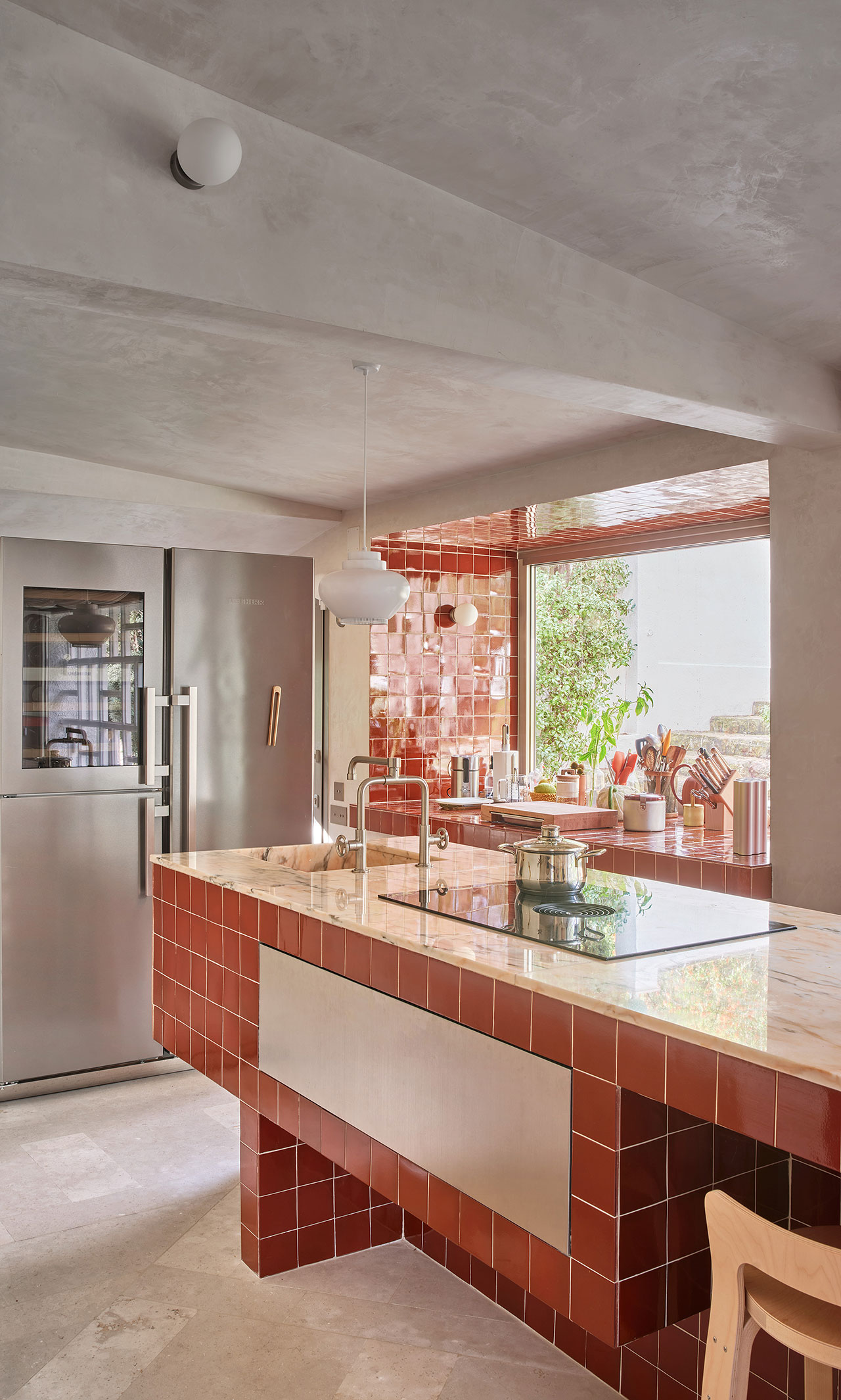 Les jardinières profondes et l’îlot de cuisine sont revêtus de petits carreaux bordeaux faits à la main, leur éclat vibrant ajoutant une touche de chaleur et d’artisanat. Ces carreaux créent une connexion visuelle entre les deux éléments déterminants de la maison, les ouvertures et l’îlot central, conférant un sentiment de continuité et de cohérence.