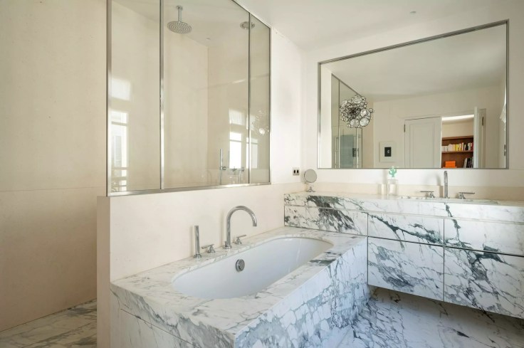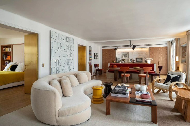 Sur une base de beige et de blanc cassé, les touches de jaune et d’orange viennent dynamiser l’ensemble des pièces. Le mobilier est un mélange de pièces vintage et d’éléments contemporains. On retrouve sur les murs de nombreuses œuvres d’art, tableaux et photographies en noir et blanc. La cuisine qui a été ouverte comme en témoigne la délimitation au plafond, se cache derrière le banc de la salle à manger, et combine des façades en bois sombre avec le marbre blanc. La lumière pénètre largement à travers les grandes fenêtres de cet appartement à la décoration intemporelle