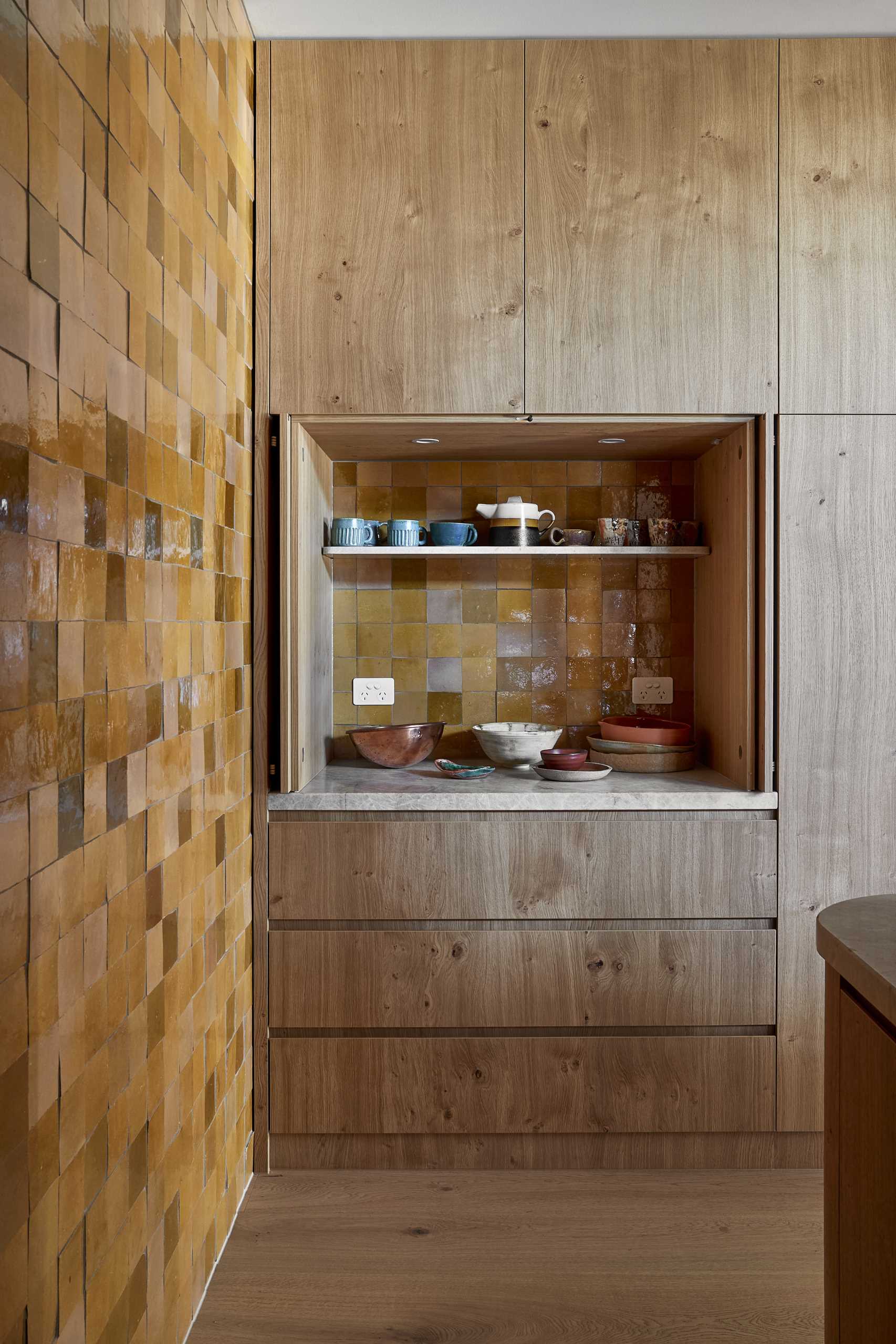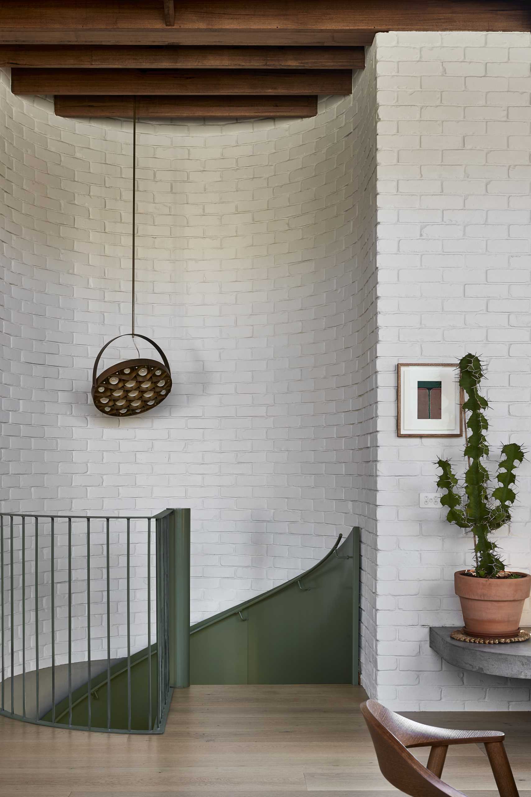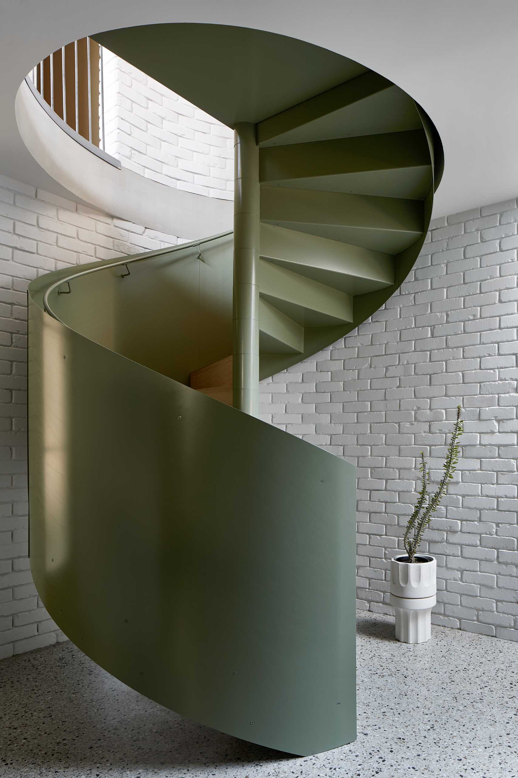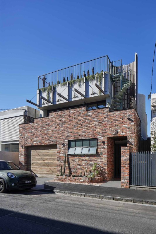 Située parmi un assortiment de maisons de ville grises, de cottages patrimoniaux et d’usines reconverties dans une rue urbaine urbaine de Melbourne, en Australie, la maison s’inspire du contexte de l’entrepôt patrimonial et joue avec la typologie de l’entrepôt.En entrant dans la maison par l’entrée compacte bordée de briques, on découvre un vaste couloir blanc. La lumière du soleil filtre obliquement à travers la lucarne linéaire, contrastant avec la texture du mur d’enceinte en briques peintes et de la cloison lisse en plâtre vénitien. Un escalier en colimaçon vert relie le niveau d’entrée aux principaux espaces sociaux de la maison.