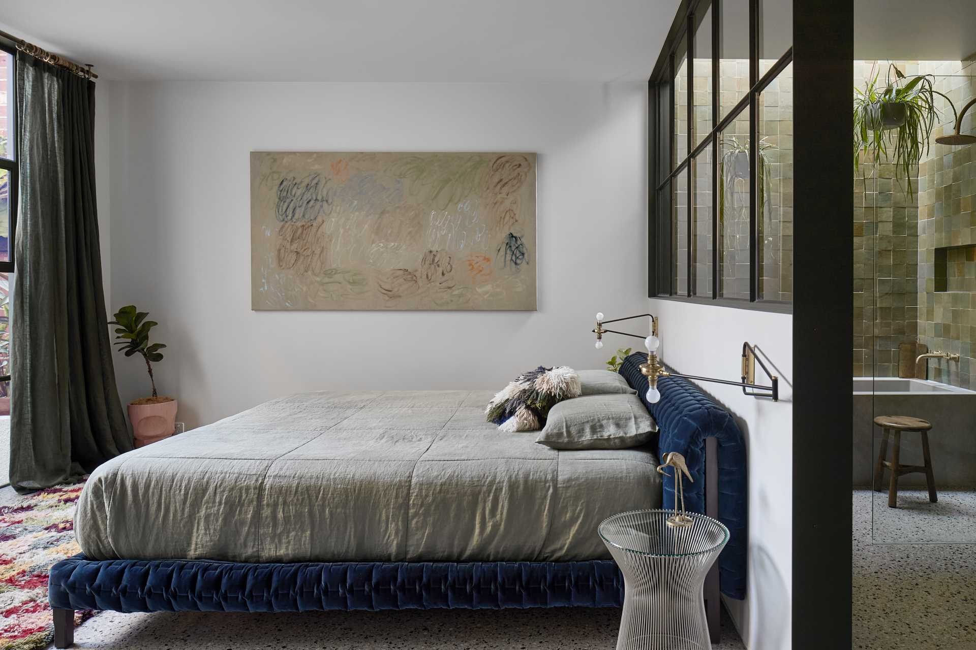 Dans le salon, le béton apparent a été associé à des briques peintes en blanc et à une cheminée en acier noir. La suite parentale bénéficie d’une cour paysagée privée. Une grande baie vitrée en acier sépare la chambre des murs verdoyants, ornés de carreaux espagnols faits main et de plantes suspendues, de la salle de bains attenante.