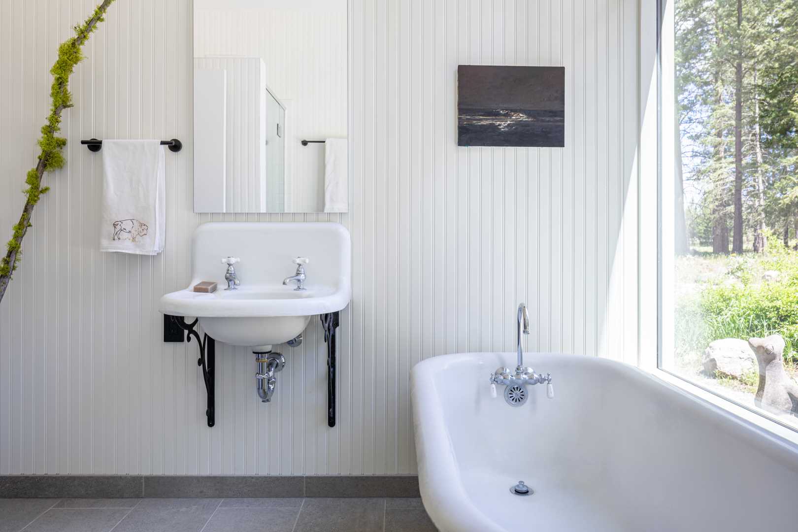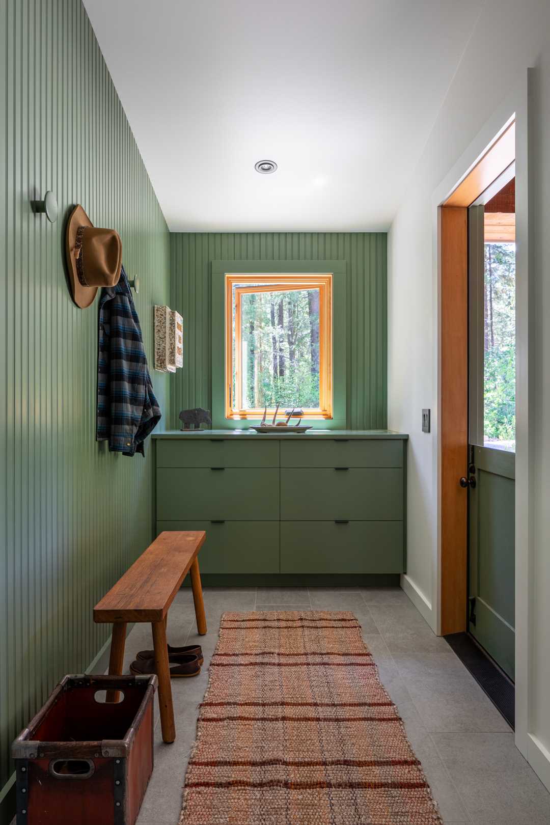 À l’intérieur, Best Practice a simplifié les détails intérieurs avec un clin d’œil à l’esthétique d’une cabane rurale, en incorporant des panneaux de lambris peints comme dans l’entrée.