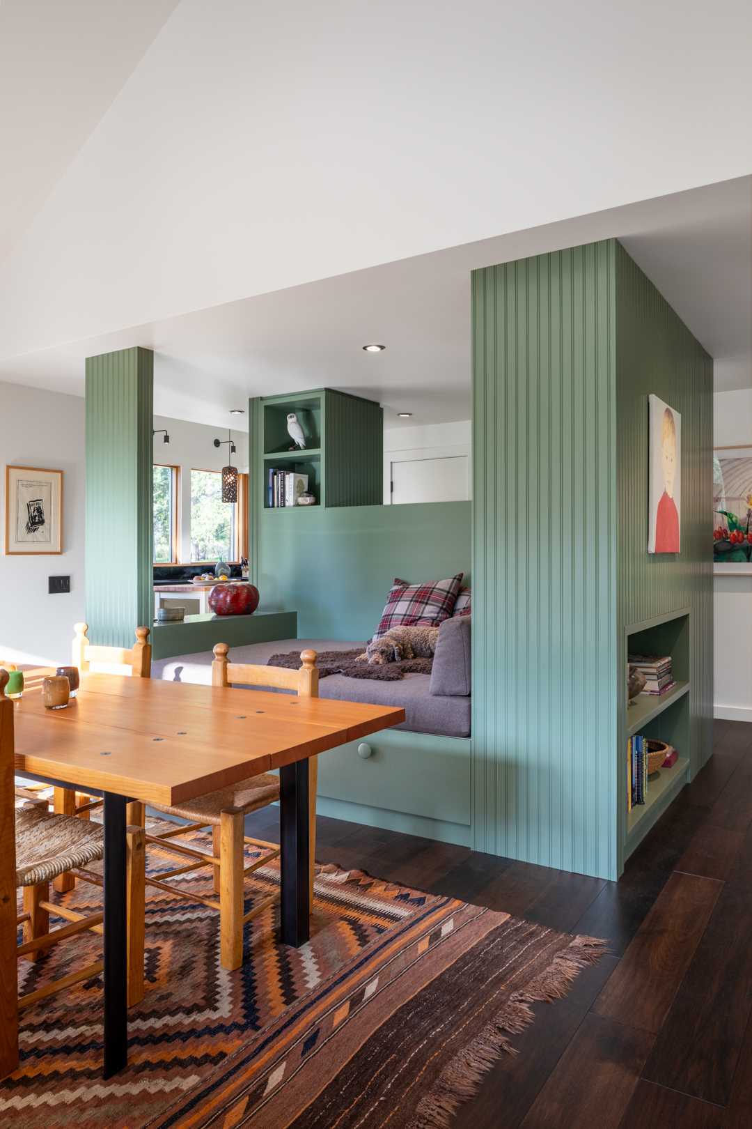 Best Practice Architecture a Methow Valley, dans l’État de Washington. L’un des éléments clés de l’intérieur est un lit de repos intégré.Le coin ouvert offre diverses fonctions. On y trouve notamment une banquette-lit pour se détendre, avec des tiroirs de rangement intégrés en dessous
