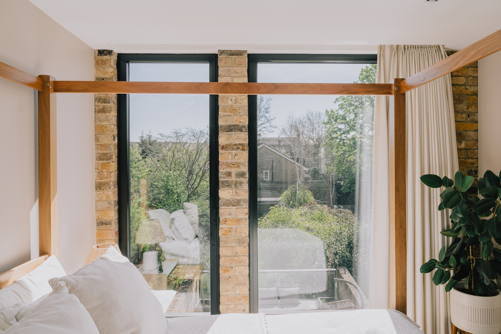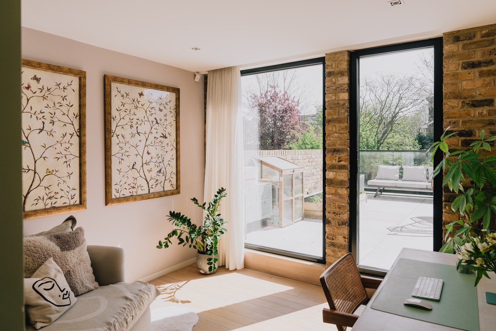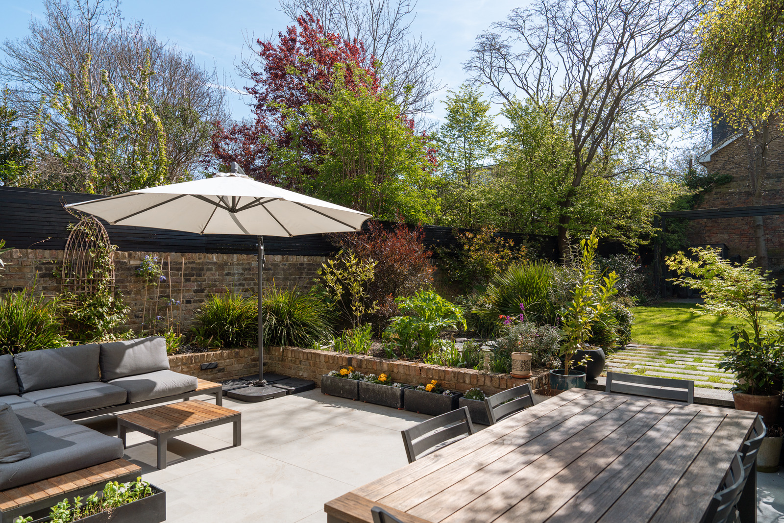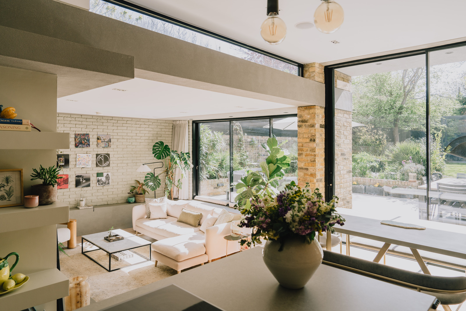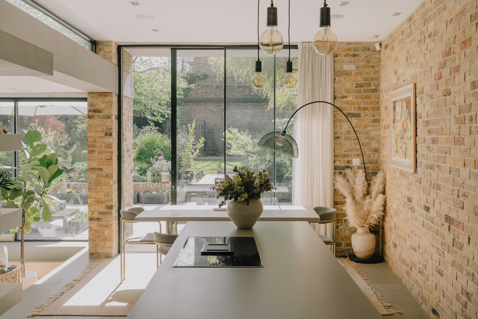 La salle à manger, de plain-pied avec la cuisine, est dotée de fines portes vitrées ouvrant sur un patio à l’arrière. Cette partie du jardin est pavée des mêmes carreaux grand format que les espaces intérieurs, abolissant ainsi les frontières entre intérieur et extérieur.