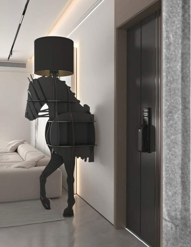 Lampe Horse Stand en forme de cheval. Si vous aimez l’extravagance, cette lampe est faite pour vous. Elle deviendra l’élément principal de la décoration de n’importe quelle pièce. Entièrement fabriquée en résine phénolique noire mate, elle est dotée d’un abat-jour en tissu bicolore. L’extérieur noir s’harmonise avec la lampe. L’intérieur doré diffuse une agréable lumière chaude.