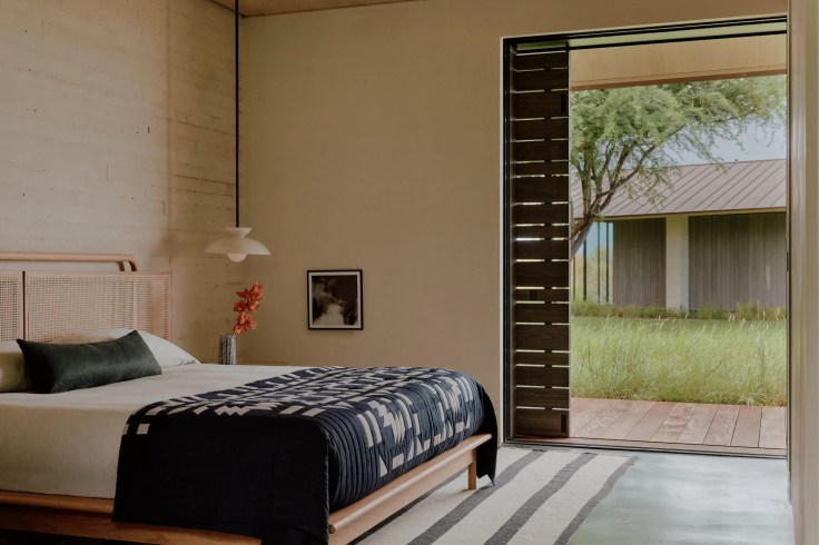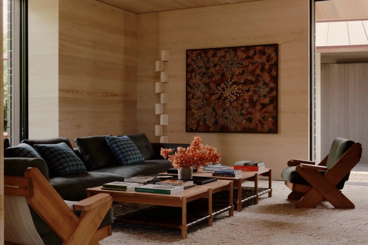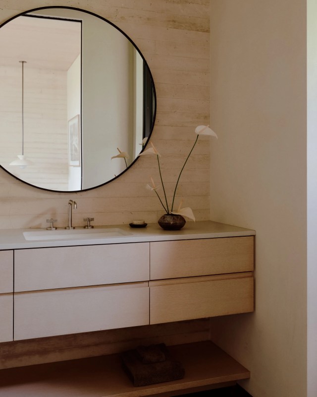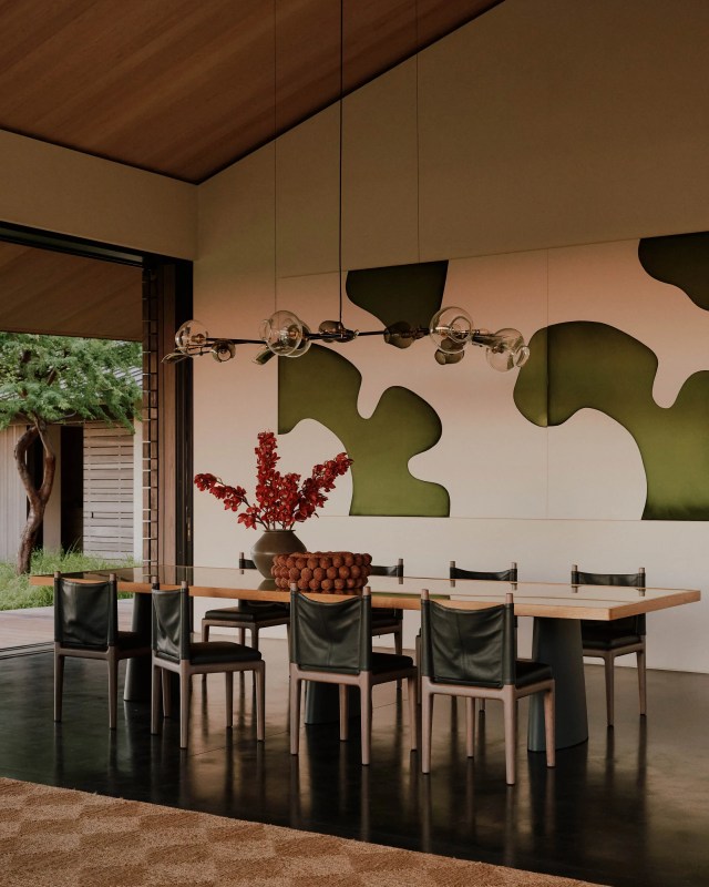 L’appréciation du paysage est le cœur de cette conception immersive qui unit si harmonieusement l’intérieur et l’extérieur. En plus des vues soigneusement choisies depuis la chambre principale, chaque espace de vie quotidien est délicatement équipé de portes coulissantes de type grange, permettant une circulation d’air agréable et offrant une invitation chaleureuse à la beauté du paysage. Les larges auvents des toits à faible pente ne se contentent pas de rafraîchir la maison ; leur revêtement en cuivre, en parfaite harmonie avec le bardage en cyprès, crée une atmosphère où le naturel s’exprime avec une belle authenticité.
