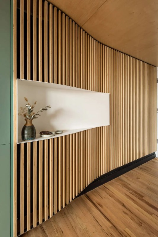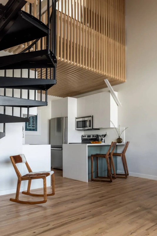 Vue intérieure du loft à deux étages avec un élégant escalier et des murs en lattes de bois sur mesure, créant une ambiance chaleureuse.