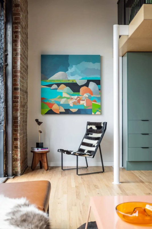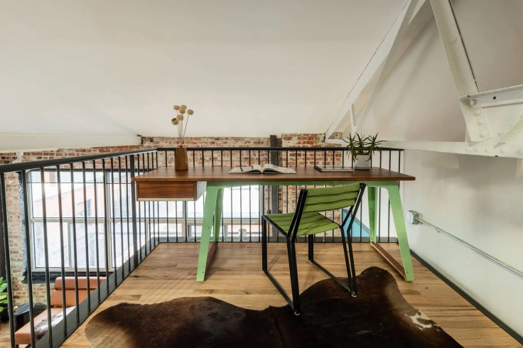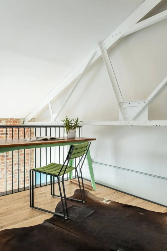 Ce loft à deux étages est un véritable bijou, avec une mezzanine élégante surplombant le salon, où un bureau peut s’installer avec charme. La chambre, accessible par un escalier ingénieux, se hisse gracieusement grâce à une poulie, un hommage aux éléments industriels soigneusement préservés lors de la rénovation. Les teintes chaudes de bleu enveloppent l’espace, apportant une douceur envoûtante qui se marie harmonieusement avec le bois clair choisi pour les menuiseries, créant ainsi une atmosphère à la fois accueillante et inspirante.