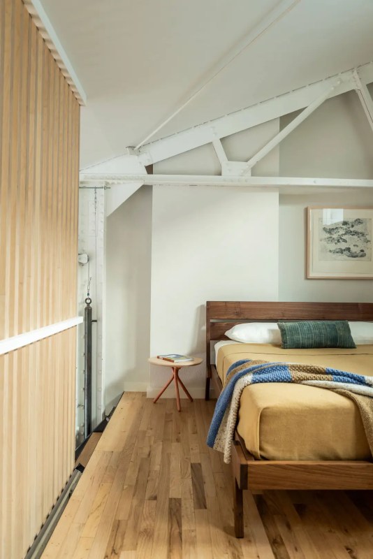 Chambre élégante du loft, alliant design moderne et éléments industriels avec un lit en bois et des touches de couleur.