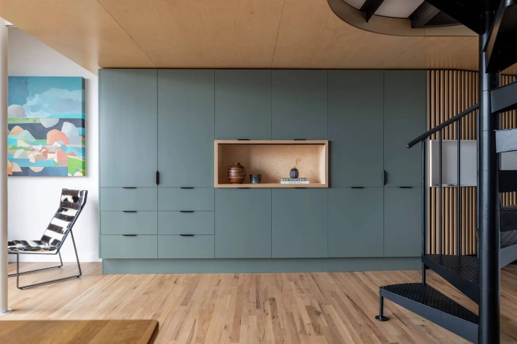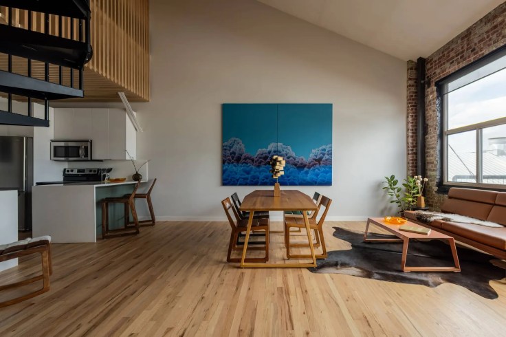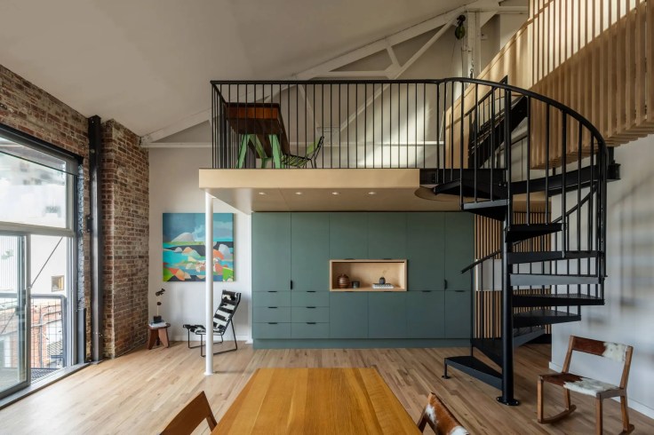 Intérieur moderne d’un loft à deux niveaux avec un escalier en colimaçon et des éléments en bois, situé dans un ancien entrepôt historique à Denver.