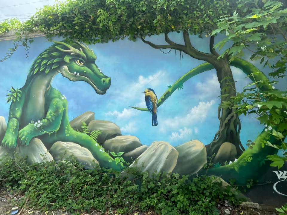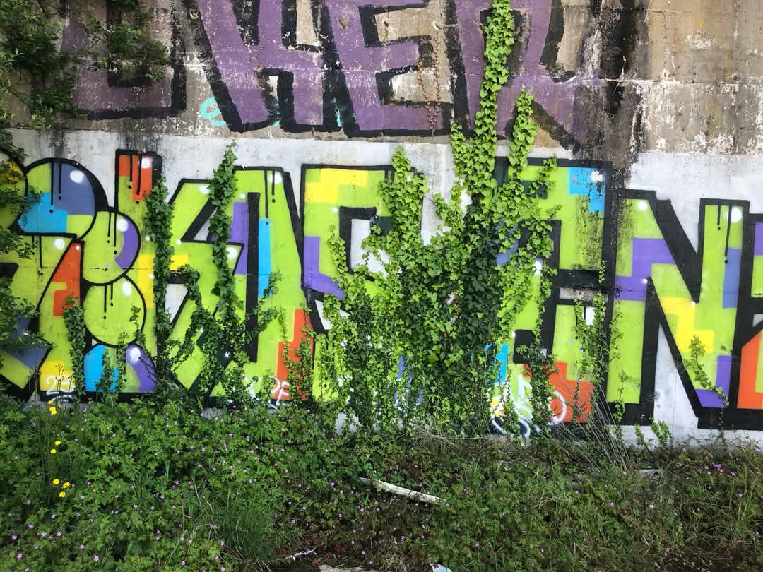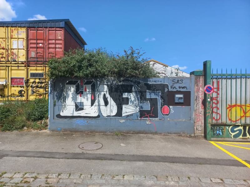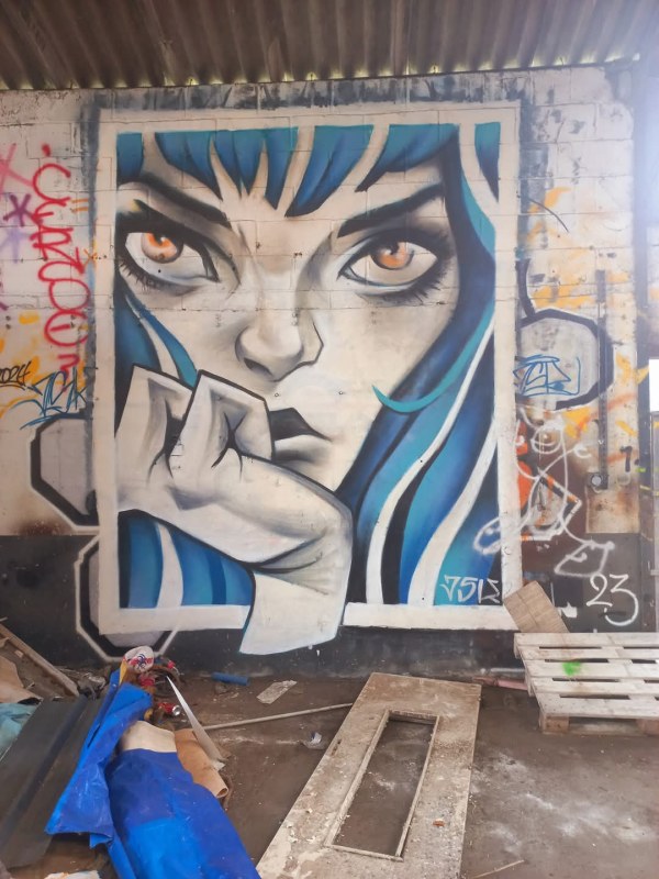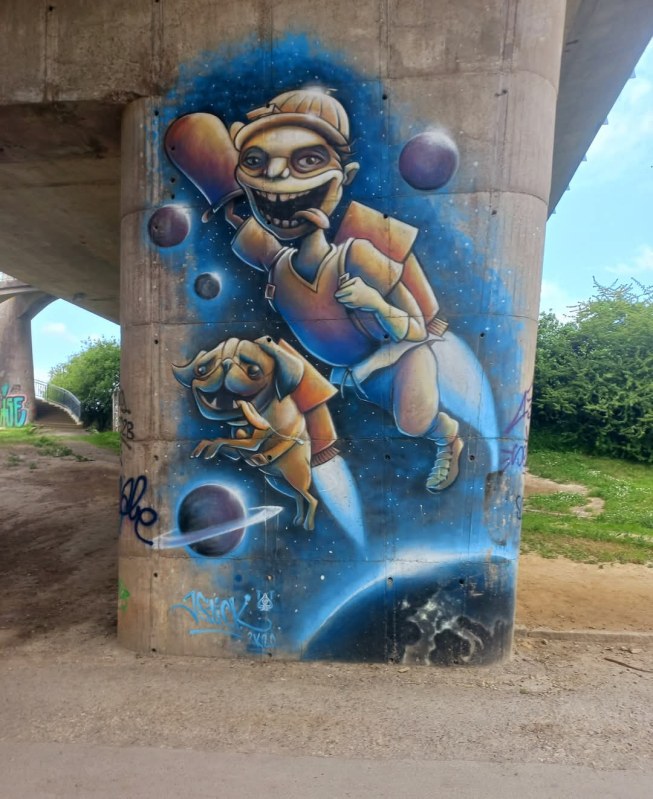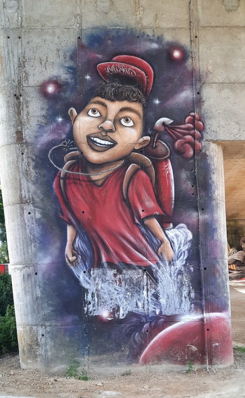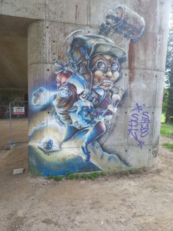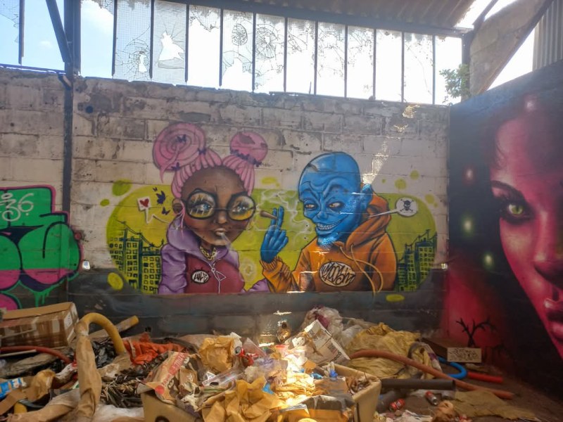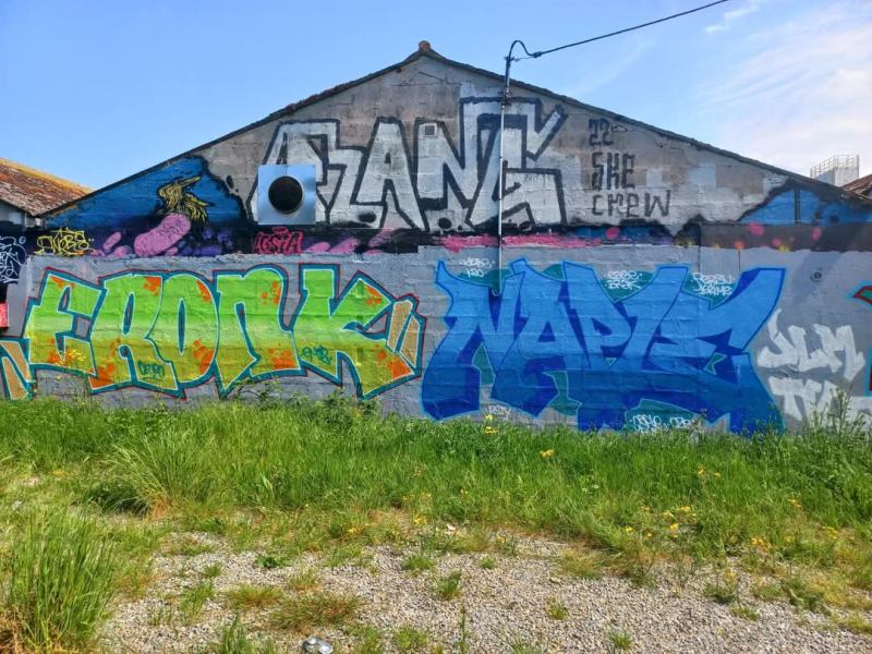 A quelques mètres de la Fresque bleue, le Diaspora Crew a posé, à son habitude, une autre fresque monumentale. L’autre façade de ce bâtiment désaffecté a servi au collectif d’artistes comme support pour créer une œuvre rendant hommage à leurs confrères, Gomz et Spazm. Sur cette fresque, la silhouette d’un graffeur, bombes aérosol à la main, semble se détacher du fond noir sur lequel il est peint. Tout comme celle d’un jeune à l’esthétique hip-hop, muni d’une auréole et d’ailes d’ange. Les artistes ont complété la pièce avec des lettrages de tous styles, montrant le maniement de ce style, ainsi que trois petits Oides. L’œuvre est nichée ici depuis 2019.