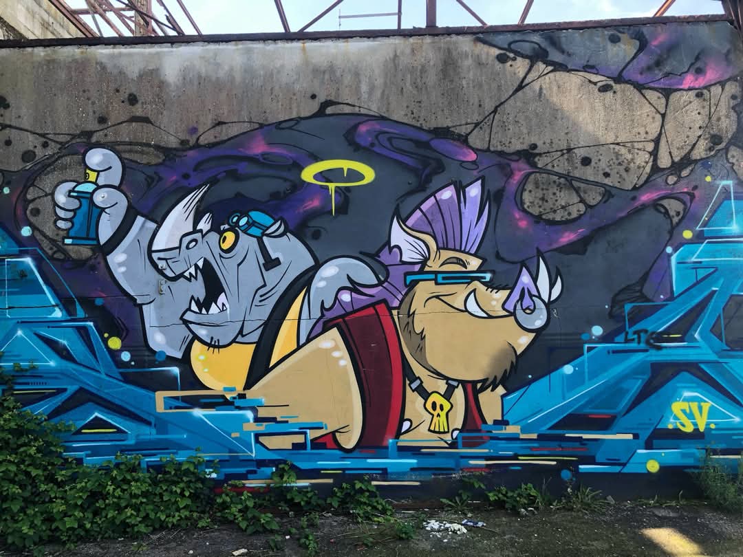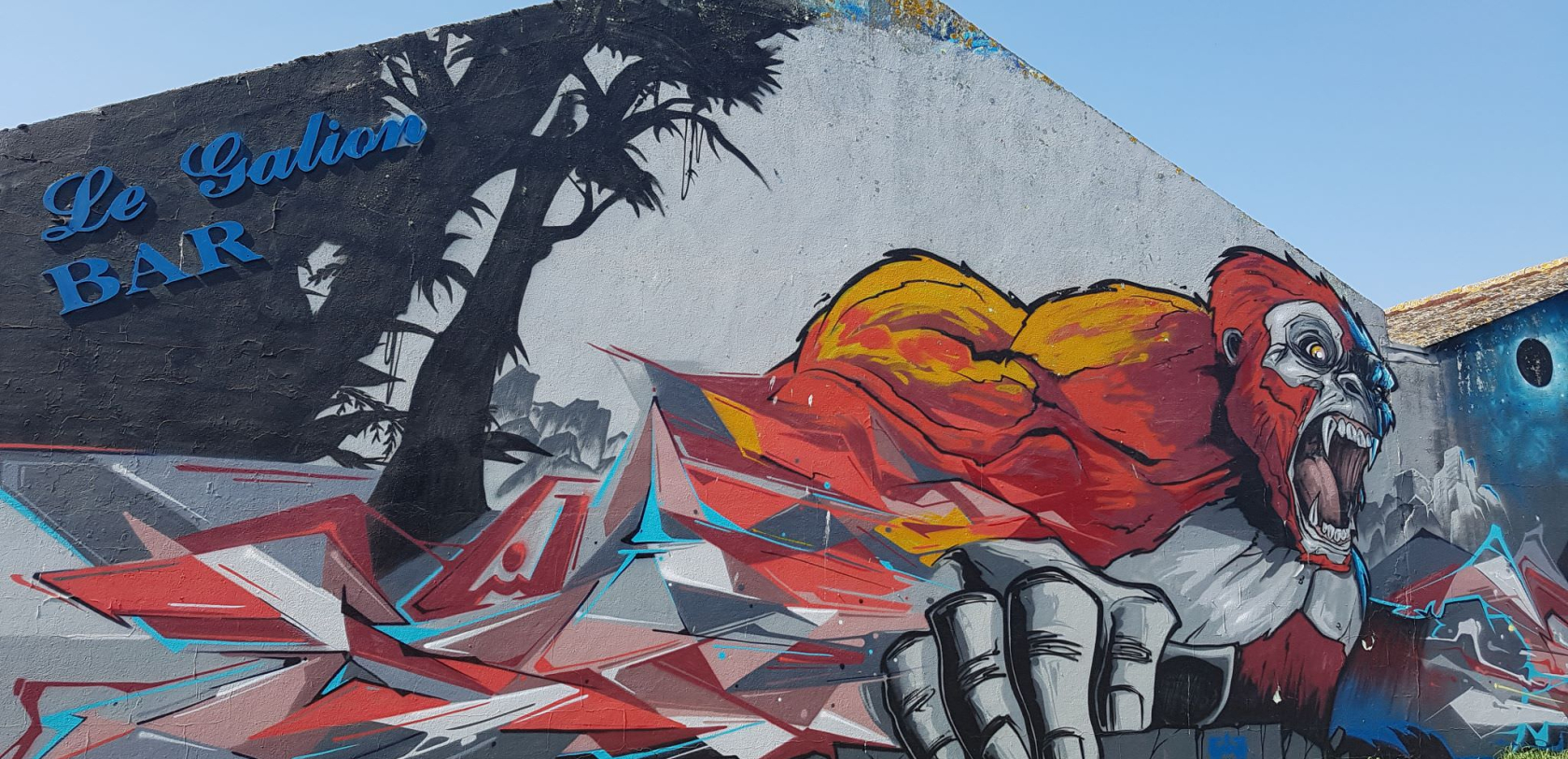 Les façades latérales du bar L’Entrepote ne manquent pas de couleurs ! Sur l’une d’entre elles, tout un univers se déploie sur des dizaines de mètres de long. A l’extrémité, on aperçoit un gorille hurlant. Les styles et les techniques de Lez et Samp se fondent dans cette composition, entre figuratif et lettrage. Une prouesse artistique dans le maniement du dessin comme des couleurs qui prouve, par ailleurs, la complicité et la relation qu’entretiennent ces deux artistes du Moker Crew.