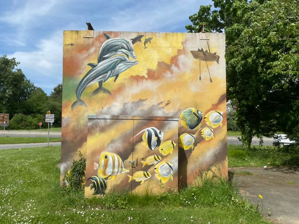 D’apparence infantile, cette fresque cache bien des choses ! C’est le centre-social du quartier Frébault qui a fait appel à l’artiste Nantais Ador pour donner des couleurs aux murs de ce blockhaus.