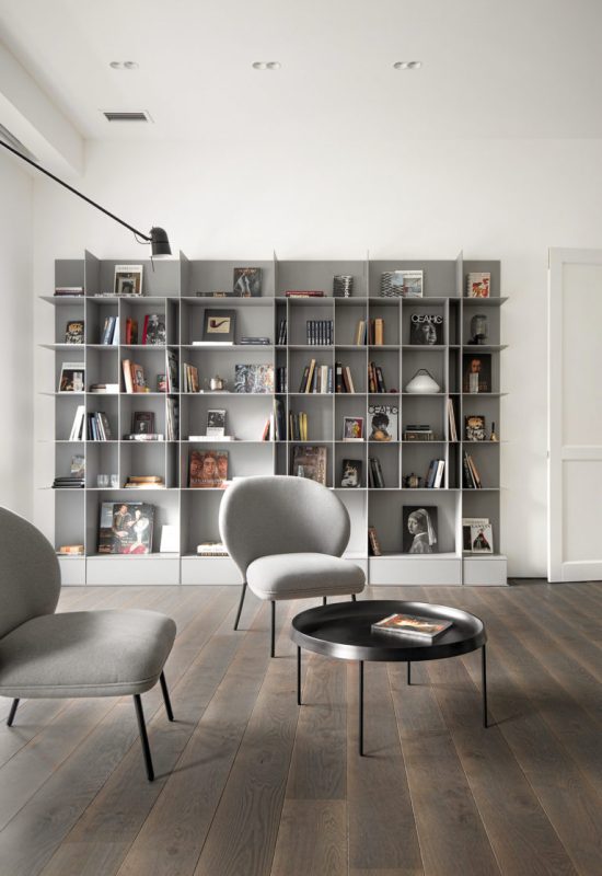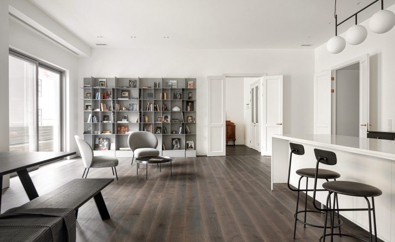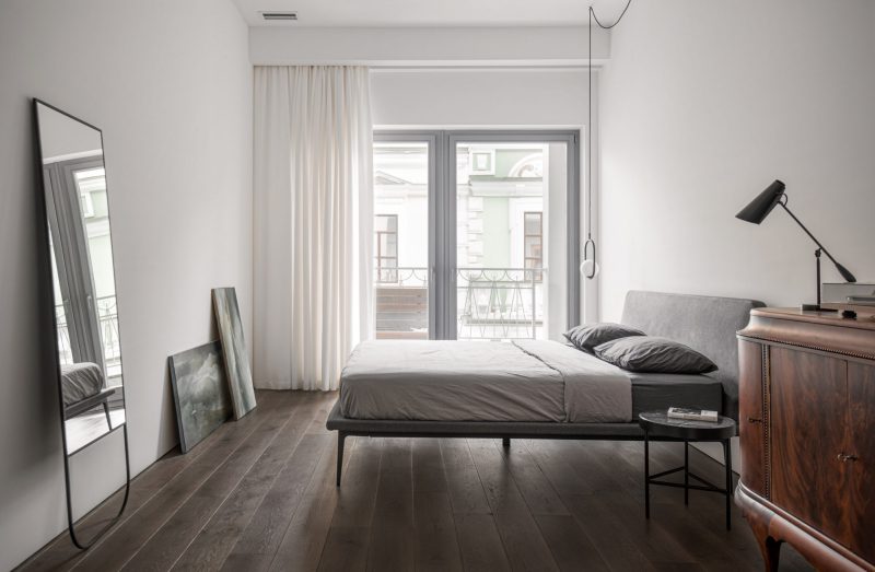 L’intérieur est construit sur un mélange d’esthétique minimaliste avec des éléments classiques. Dans le spacieux salon, une élégante bibliothèque en métal jouxte des portes doubles classiques avec des ferrures en cuivre ; dans la chambre, une armoire française ancienne se détache du lit simple ; dans la salle de bain blanche ascétique, une baignoire en cuivre de forme classique jouxte une élégante échelle en métal pour les serviettes et un meuble sous-vasque à cadre ; dans la chambre d’amis, une commode ancienne a été choisie comme élément classique…