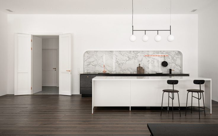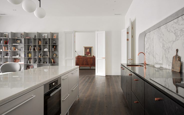 C’est avec une attention délicate que le studio de design INT2 a entrepris la rénovation de cet appartement chaleureux à St-Pétersbourg. Une décoration grise et minimaliste a été choisie, permettant aux volumes de s’épanouir avec élégance. Le mobilier ancien et la baignoire en cuivre ajoutent une touche de richesse et de caractère, se mêlant harmonieusement aux lignes épurées du mobilier design, des sols gris et des murs blancs. Les pièces principales, judicieusement positionnées le long des fenêtres, accueillent un maximum de lumière naturelle, tandis que la salle de bain, le dressing et la buanderie, bien que sans accès direct aux fenêtres, apportent leur fonctionnalité discrète. Ce mélange subtil de classique et de contemporain crée un espace à la fois confortant et inspirant.