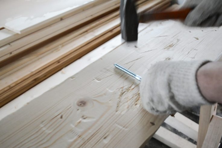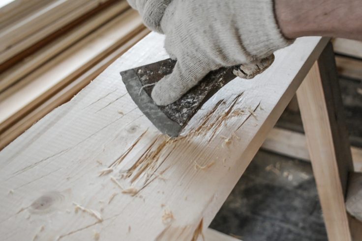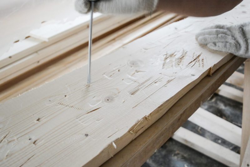 Avec une furie créative, nous frappons le cœur de la planche avec notre hache, martelant les bords pour leur donner une allure saisissante et irrégulière, nous rayonnons cette énergie, brisons les limites, et laissons libre cours à notre imagination ! Nous répétons la même chose avec un marteau et un tournevis. Vous devez obtenir une belle surface irrégulière.