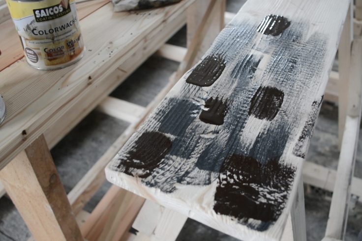 Nous nettoyons les planches de la poussière de bois avec une brosse. Nous appliquons de l’huile de différentes nuances sur la planche par points, en frottant l’huile avec un chiffon pour obtenir une teinte complexe.