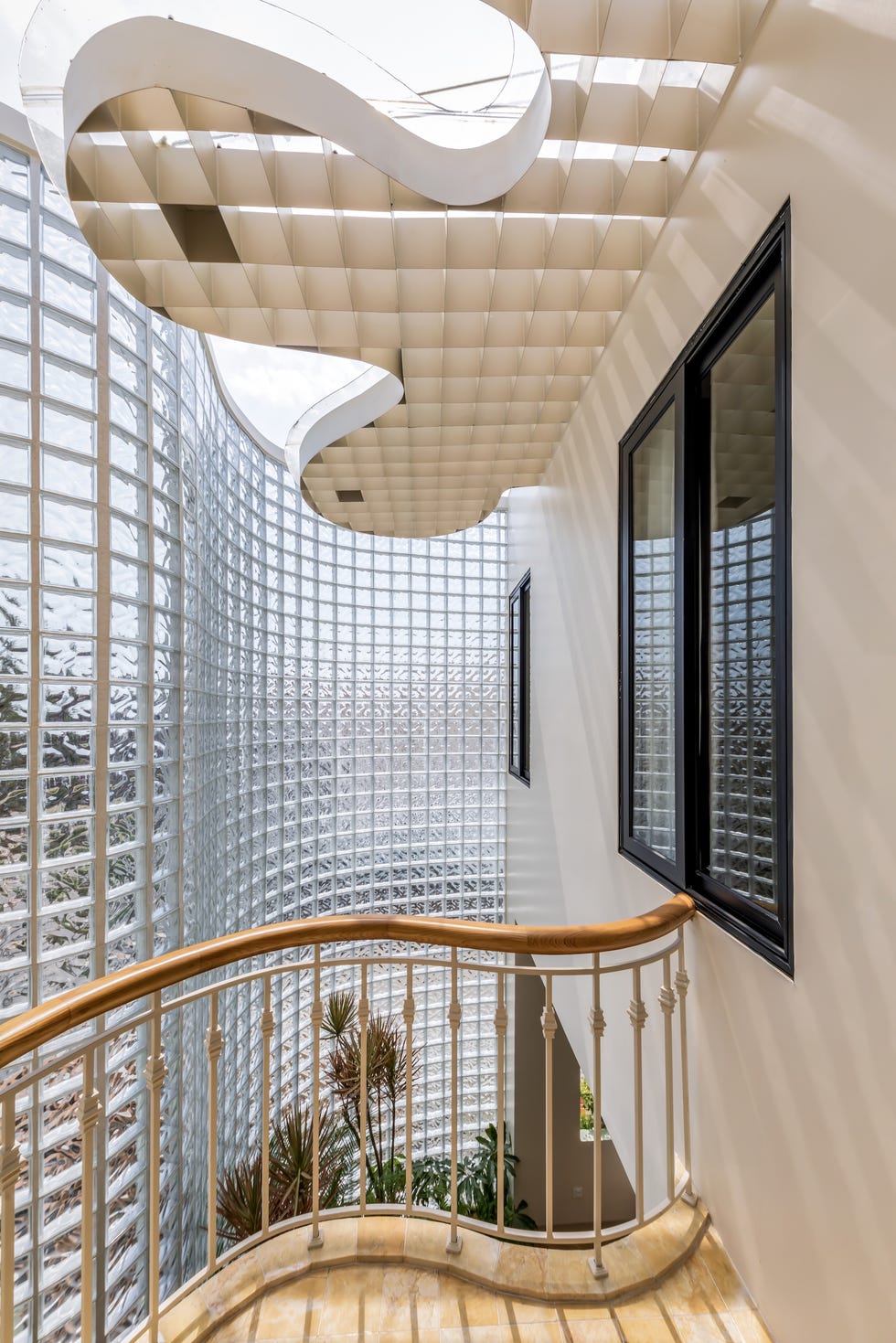 les architectes ont opté pour un système d’enveloppe en briques de verre courbées , dont la réalisation représentait un défi technique important. « La construction de la façade incurvée, composée de plus de 3 000 briques de verre, a présenté plusieurs défis, exigeant une grande précision dans l’exécution structurelle et les techniques d’assemblage pour garantir à la fois l’esthétique et la sécurité. »