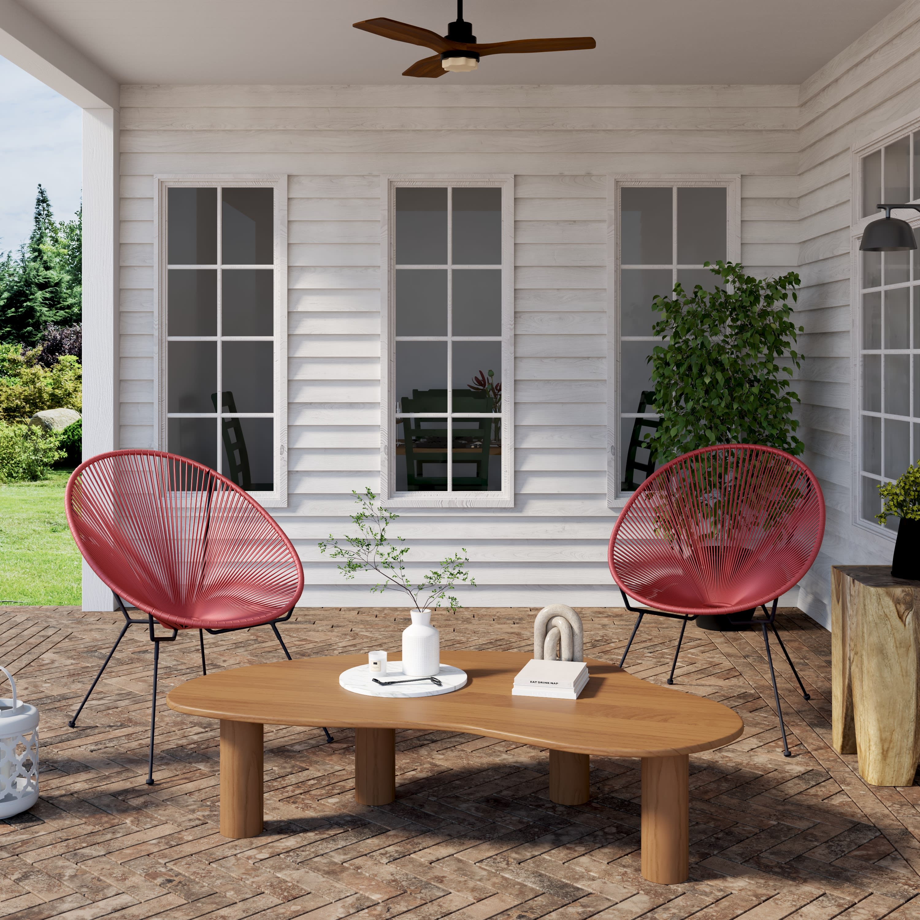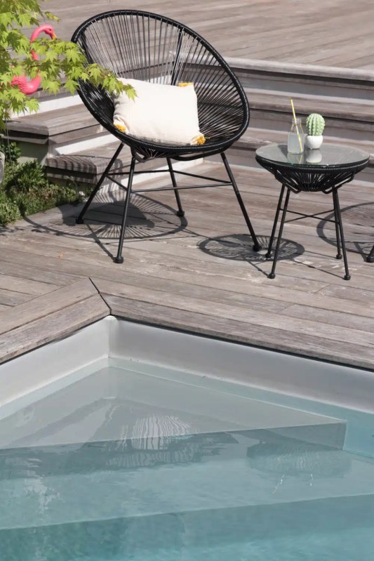 Une petite table, des paniers pour poser un livre ou de la crème solaire, quelques coussins, des fauteuils et hop, on s’installe, un cocktail à la main, sur la terrasse ou au bord d’une piscine. Chez Home Déco Design on est des inconditionnelles de ce fauteuil en fil de scoubidou, graphique aussi à l’aise à l’intérieur qu’à l’extérieur. Un must-have.