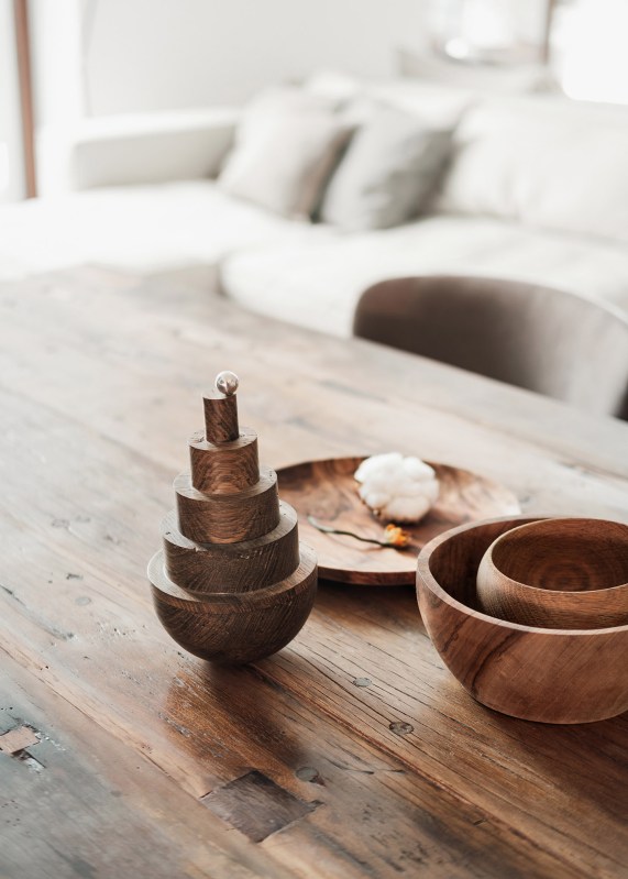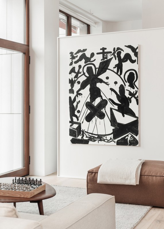 L’intérieur est réalisé dans une esthétique minimaliste : un fond neutre (murs blancs, parquet chaleureux) avec des accents sur les objets d’art de la collection et le mobilier du client.