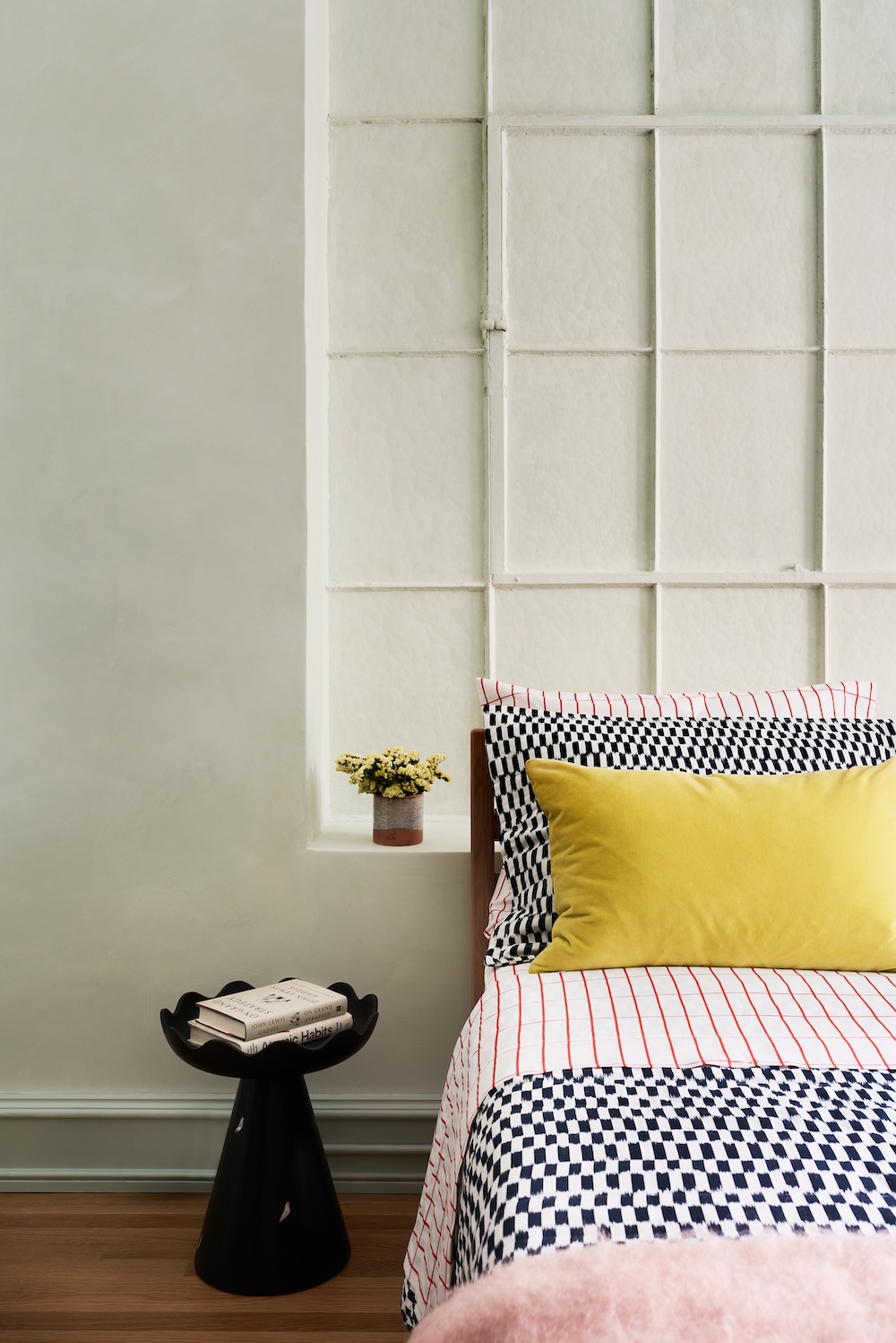 Pour y parvenir, un espace commun ininterrompu a été conservé le long des grandes fenêtres existantes donnant sur la rue, du côté large du bâtiment. Une colonne vertébrale intégrée de 11 mètres de long en bois et en métal perforé fait office de buffet, de console multimédia, de climatisation et d’élément de rangement, s’étendant sur toute la profondeur de l’appartement, du salon à la cuisine et au salon. Cet élément permet de garder l’espace ouvert, en gardant les rangements et les fonctions encombrantes en périphérie.