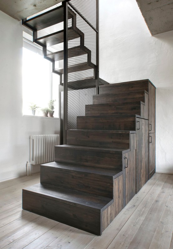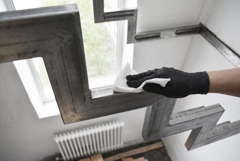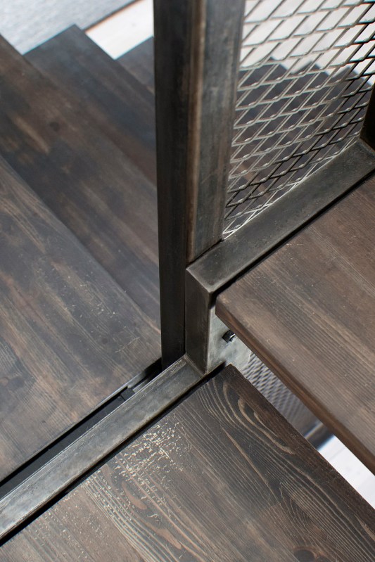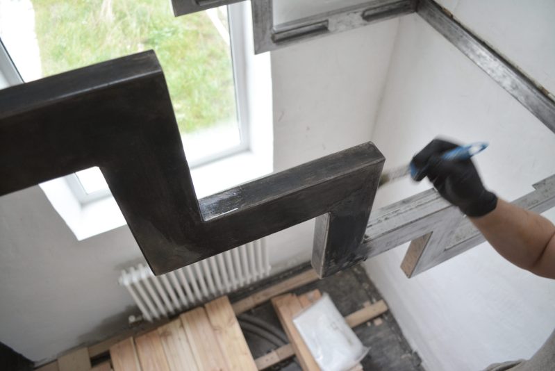 Pour donner aux objets métalliques et aux éléments intérieurs un aspect vieilli et révéler leur texture, nous avons utilisé une méthode appelée bleuissement, qui est le plus souvent utilisée dans l’industrie de l’armement. Le projet utilise la méthode la plus simple : le bleuissement chimique à l’acide. (Le bleuissement par rouille consiste à recouvrir le métal d’acide. On utilise généralement de l’acide nitrique ou chlorhydrique . Cela permet à la pièce de rouiller uniformément. Il suffit ensuite de frotter la rouille et de répéter l’opération jusqu’à l’obtention de la couleur souhaitée.) La structure métallique la rampe de l’escalier, les poignées des façades, les vis et les charnières des meubles.