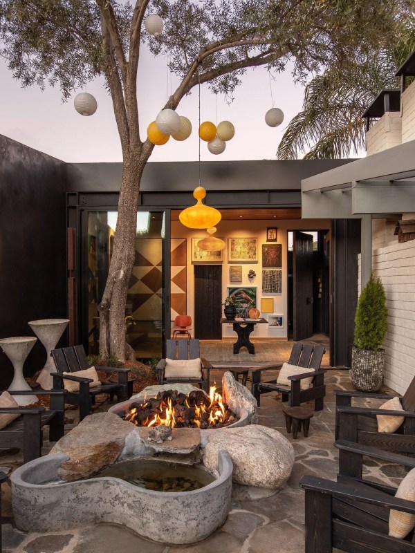 Les suspensions donnent un air festif et léger associé au brasero et au bassin en pierre inspirés de ceux en béton du designer Willy Guhl. © Laure Joliet