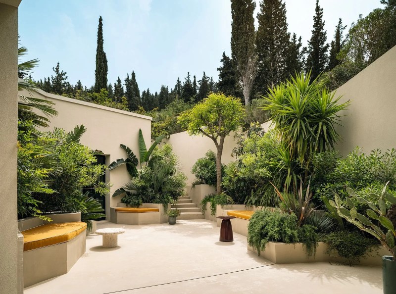 Face aux banquettes en béton intégrées à l’aménagement du patio, les guéridons de jardin en travertin et plateau laqué s’intègrent au décor avec sobriété. © Jean-Pierre Gabriel