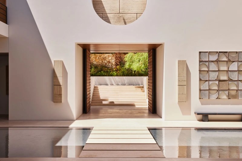 Les bassins jouent comme des miroirs de chaque côté de l’entrée de la maison. Les sculptures et les décorations murales de l’artiste Ishmael Randall Weeks viennent rompre les lignes abstraites des volumes. © Sam Frost / Stylisme Lisa Rowe