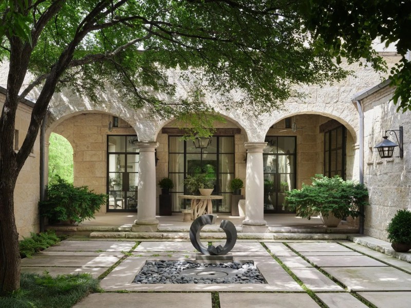 Le sol, particulièrement travaillé dans la minéralité du lieu, associe une sculpture en marbre, des galets, un calepinage original en dalles de pierre et de gazon. © Douglas Friedman / Stylisme Anita Sarsidi