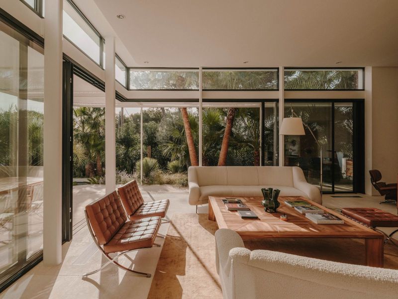Au rez-de-chaussée, un grand espace ouvert avec un salon, une cuisine américaine et une salle à manger, donnant sur le jardin. Les grandes baies vitrées permettent d’abolir les frontières entre intérieur et extérieur, comme souvent en Méditerranée.