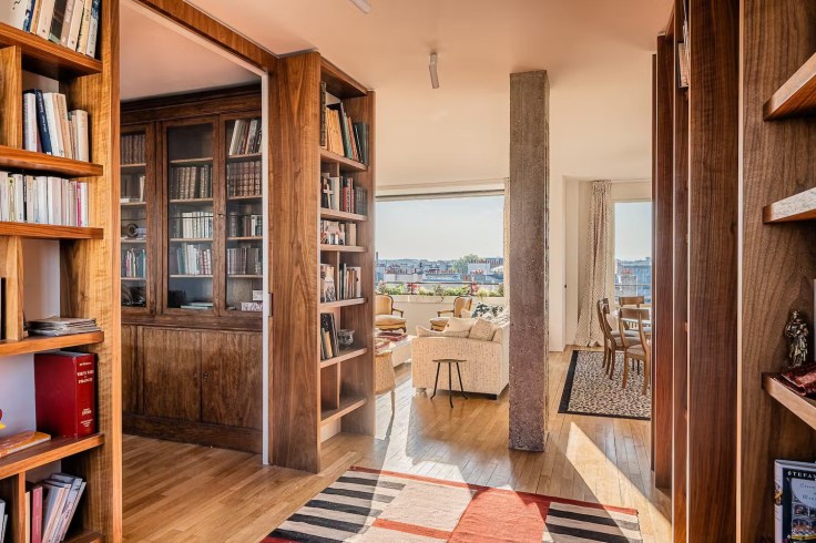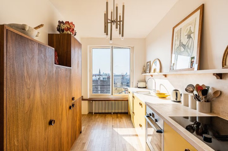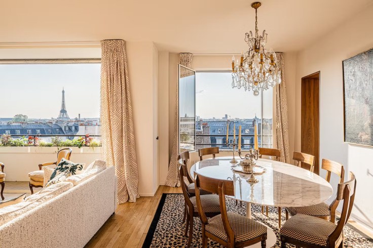 Le chic du milieu du siècle dernier offre une vue à 360 degrés sur la ville dans cette résidence du 7e arrondissement de Paris . Un coin salon sur le toit propose une vue imprenable sur l’horizon de Paris. Les impressions et textures se combinent : léopard et carreaux, marbre et cristal, dans le salon et la salle à manger ouverts. La Tour Eiffel, les jardins du Luxembourg et les restaurants et boutiques du quartier Saint-Germain-des-Prés se trouvent tous à quelques pas seulement. On aime Le Style Vintage: Un Voyage des Années 50