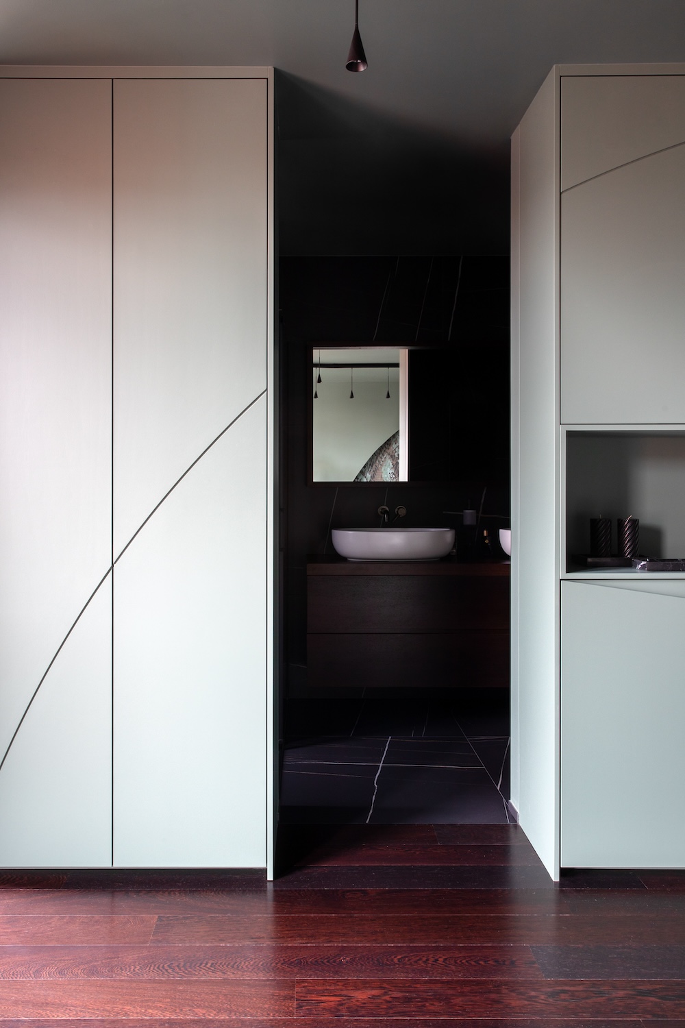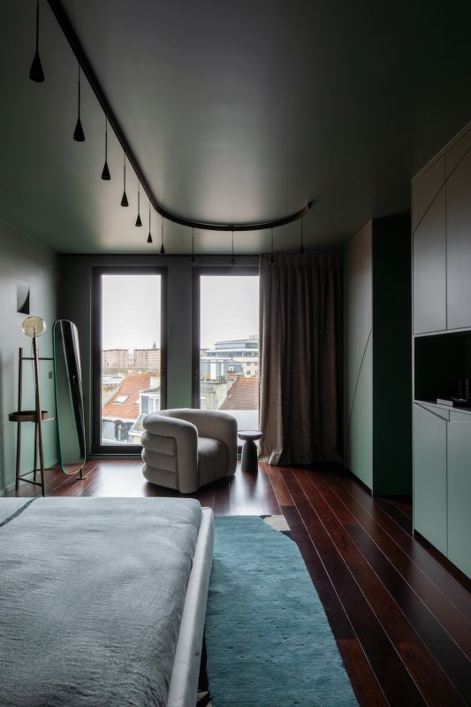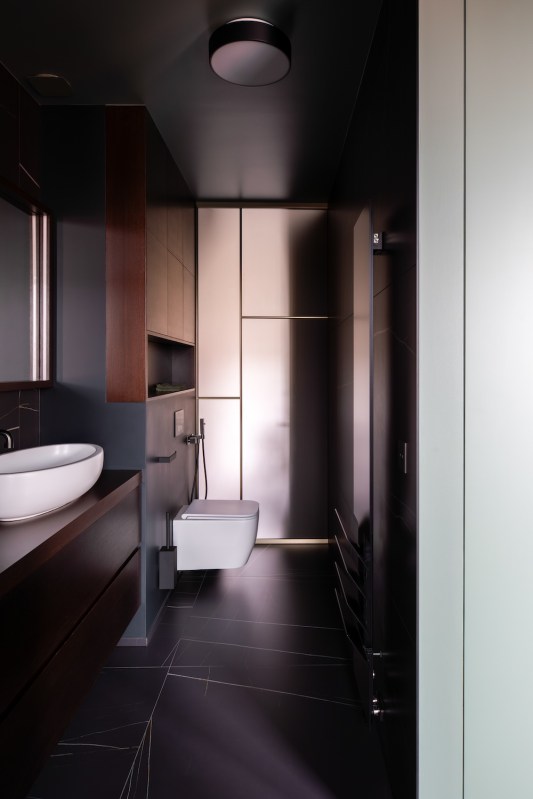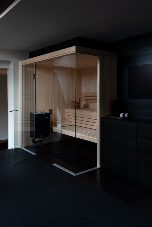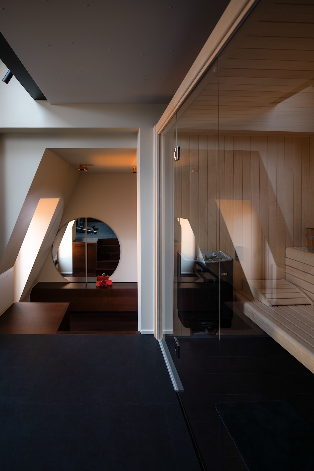 Dès l’entrée, nous sommes accueillis par un revêtement métallique exceptionnel sur-mesure en provenance d’Italie. Orienté horizontalement, il présente une palette de couleurs bronze. C’est surprenant car il dissimule de nombreux espaces de rangement et donne accès au spa .Des volumes généreux L’architecte Isabel Gómez a ainsi du concevoir des espaces de vie sophistiqués mais fonctionnels, où l’ergonomie et les matériaux sont adaptés en fonction du style de vie jeune et dynamique
