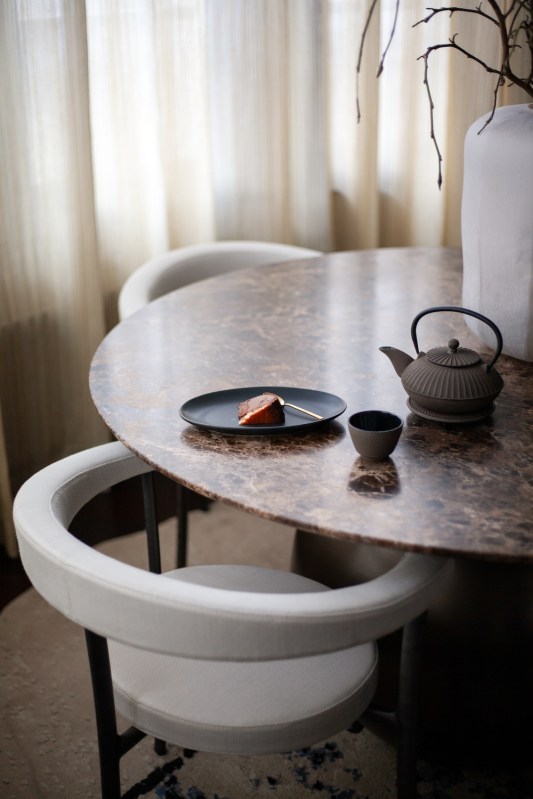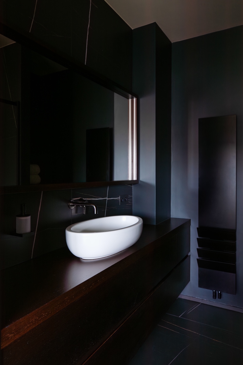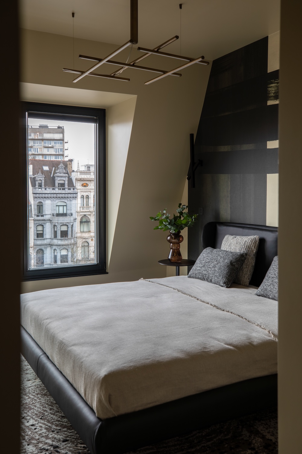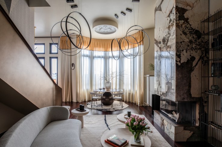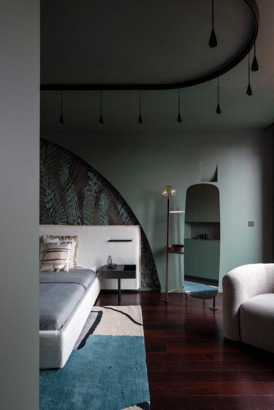 Dès l’entrée, nous sommes accueillis par un revêtement métallique exceptionnel sur-mesure en provenance d’Italie. Orienté horizontalement, il présente une palette de couleurs bronze. C’est surprenant car il dissimule de nombreux espaces de rangement et donne accès au spa .Des volumes généreux L’architecte Isabel Gómez a ainsi du concevoir des espaces de vie sophistiqués mais fonctionnels, où l’ergonomie et les matériaux sont adaptés en fonction du style de vie jeune et dynamique