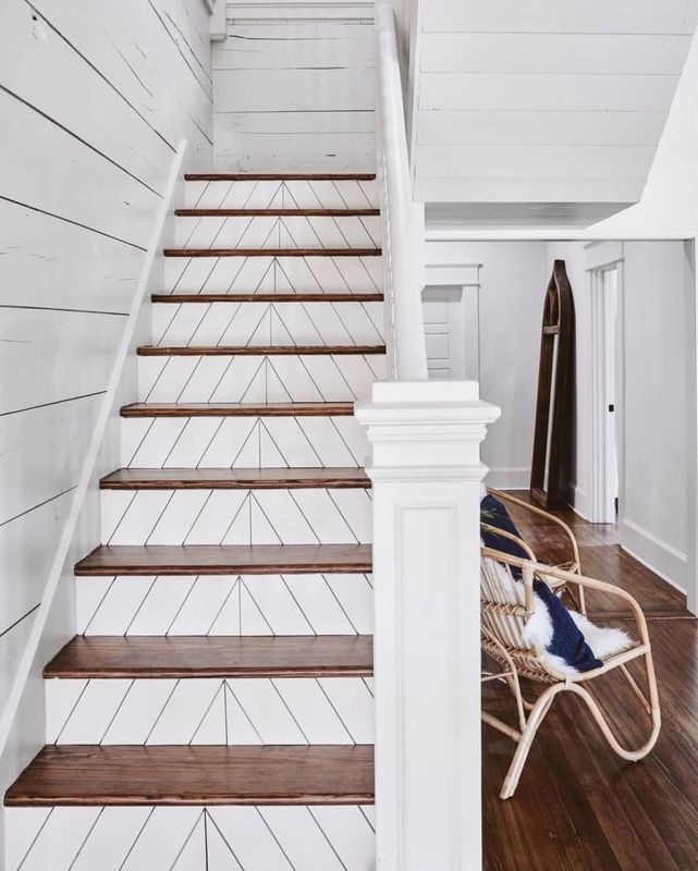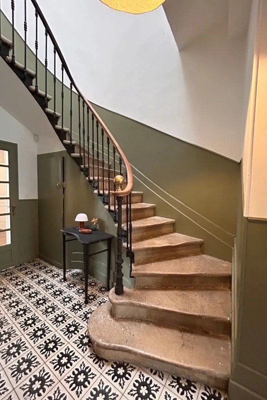 - Peinture contrastante : Pour apporter de la couleur à votre escalier et créer une dynamique visuelle, n’hésitez pas à peindre le soubassement dans une couleur contrastante par rapport au reste du mur. Si vous n’en avez pas, choisissez de le créer visuellement soit par un jeu de couleur, soit en le définissant avec une petite baguette.