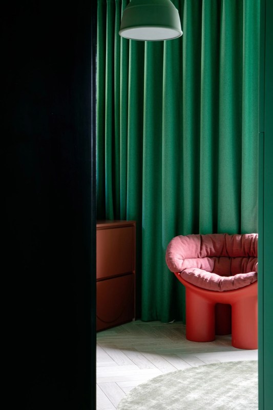 Le vert a été utilisé comme fil conducteur dans toute la maison, clin d’oeil au paysage environnant. En fonction de la période de l’année, les couleurs ont tendance à changer, le studio a donc pu ajouter d’autres couleurs riches qui ancrent le vert, comme les bordeaux et les oranges vifs. On pourrait supposer que ce mélange de couleurs entrerait en conflit, mais les tons et les textures choisis garantissent un rendu harmonieux