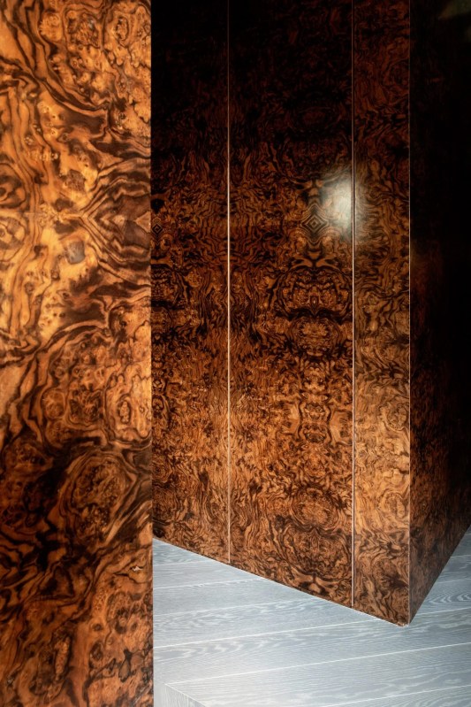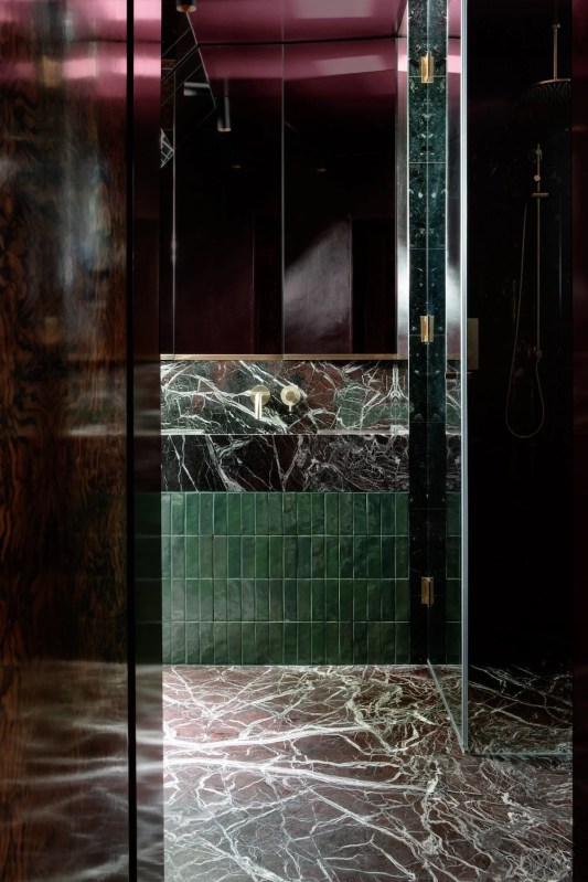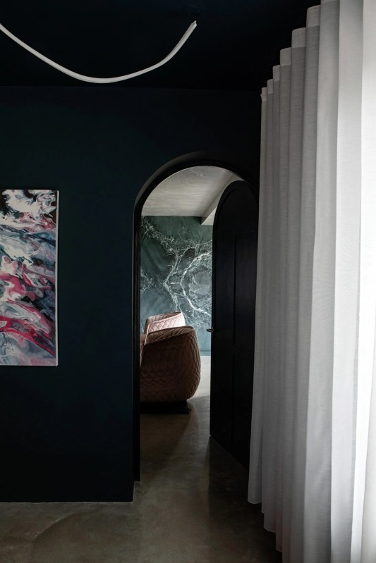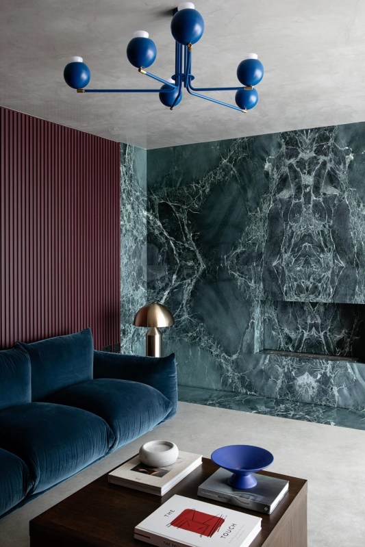 Le salon comprend des canapés en velours bleu et un mur vert recouvert de marbre tourbillonnant assorti à des livres, équipé d’une alcôve réservée à une subtile cheminée.