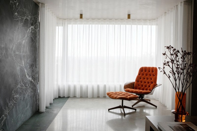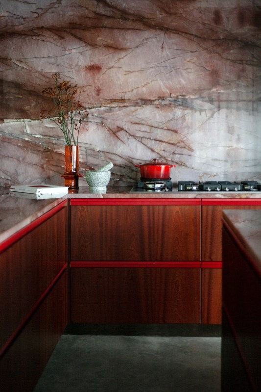 Les concepteurs se sont ainsi inspirés de Verner Panton avec son utilisation de couleurs contrastées, de formes ludiques et d’éléments surdimensionnés. Le rez-de-chaussée a été adapté pour inclure une cuisine ouverte définie par un comptoir, un îlot et une crédence finis en quartzite rouge veiné. Du bois aux tons rubis a été utilisé pour créer les armoires géométriques.