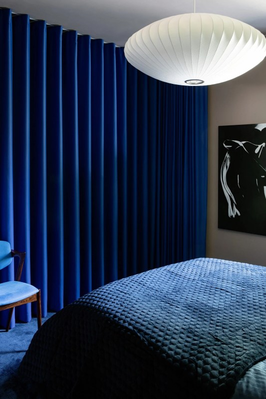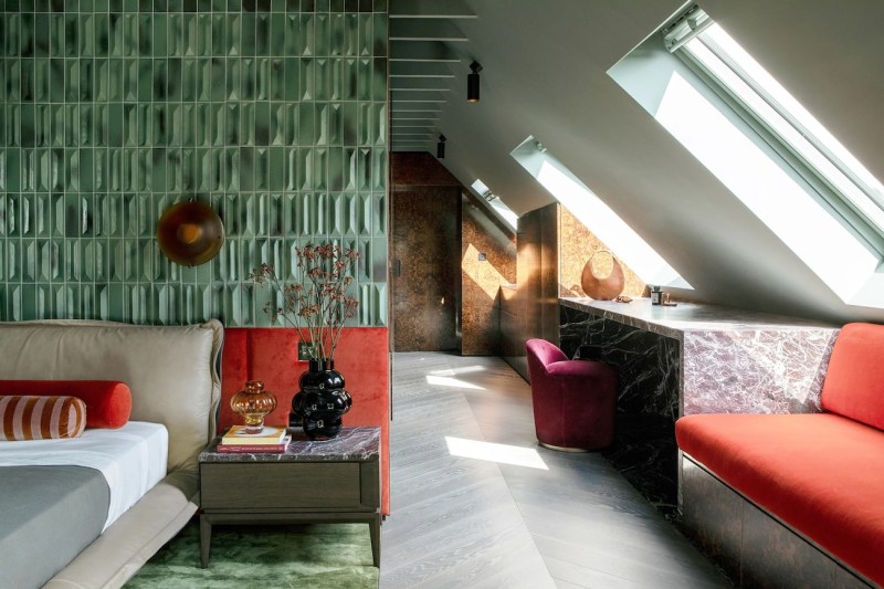 À l’étage, la chambre principale et la salle de bains privative étaient habillées des mêmes intérieurs éclectiques que les espaces communs.