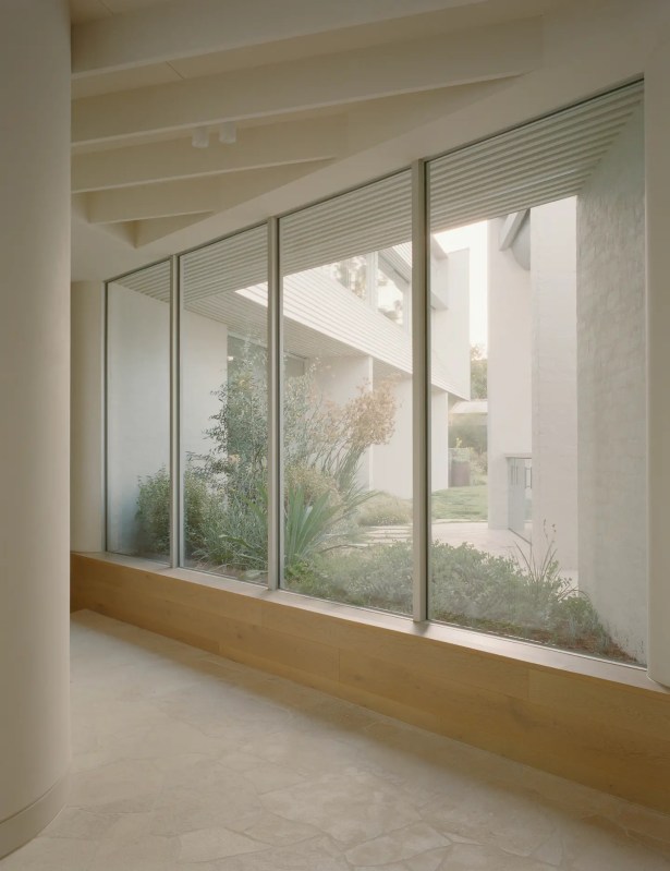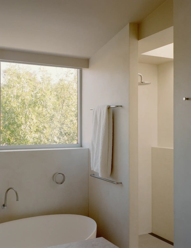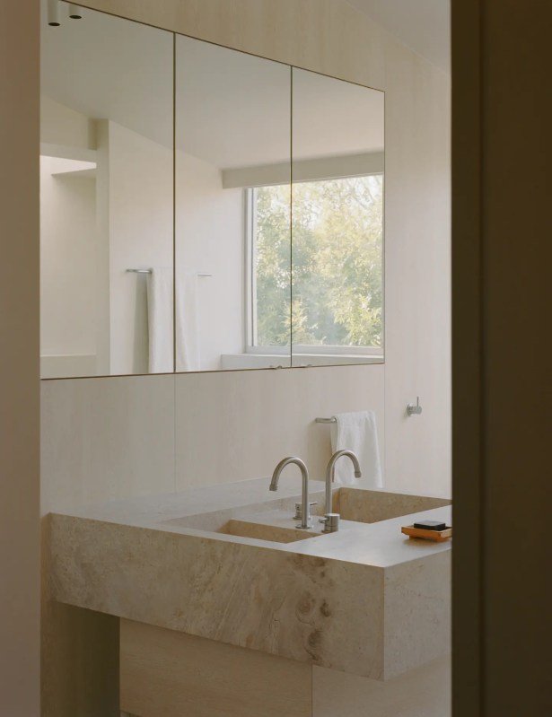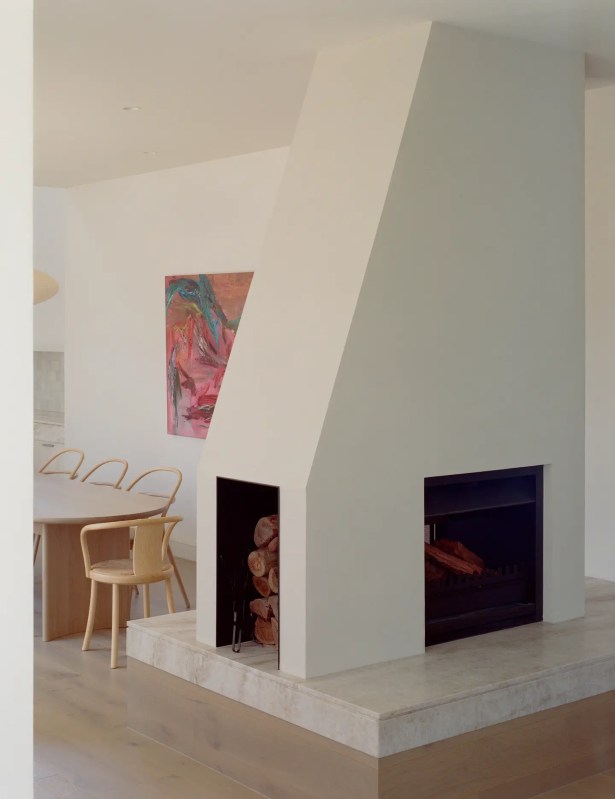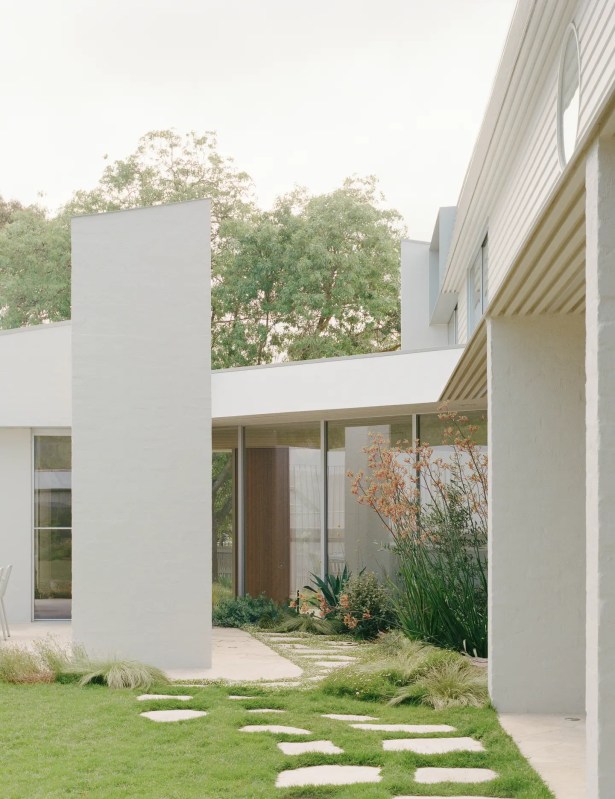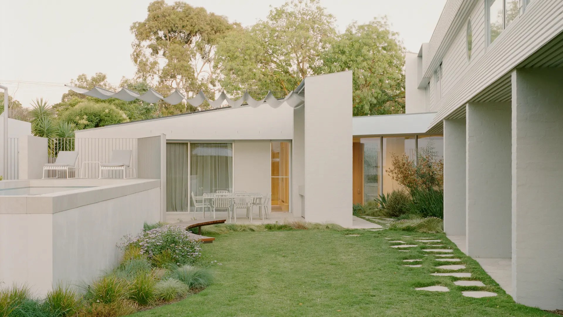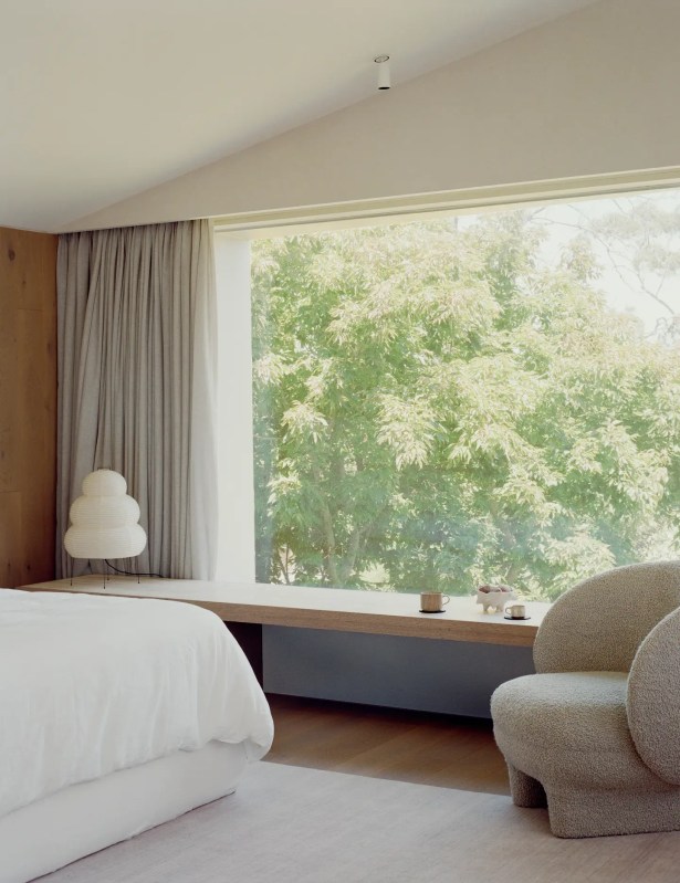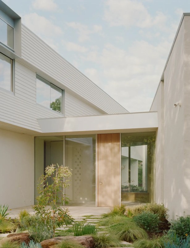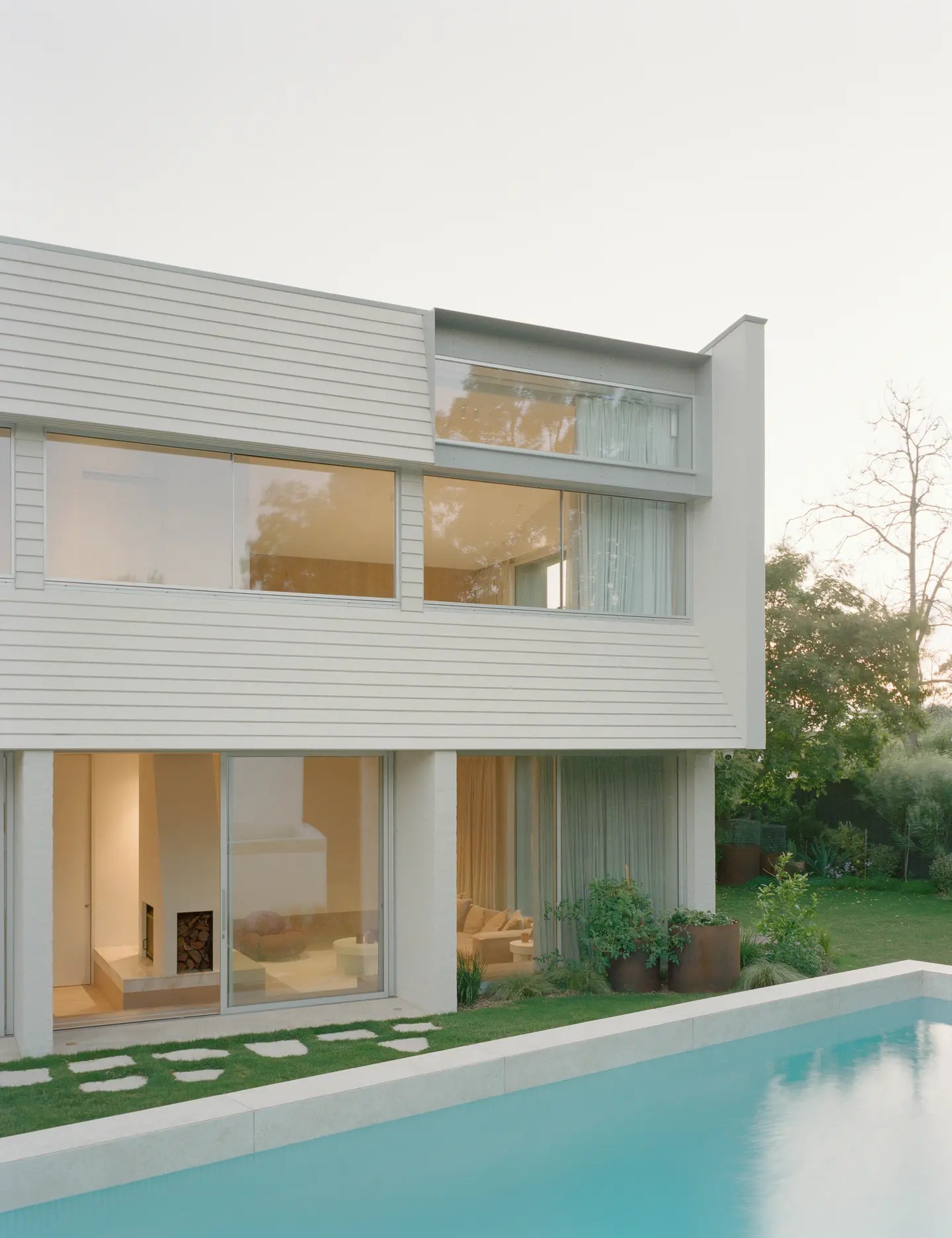 Les espaces intérieurs (espaces communs au rez-de-chaussée, avec les chambres et les salles de bains au-dessus) sont orientés vers le nord pour surplomber l’espace extérieur paysager par Peachy Green et la piscine hors sol sculpturale.