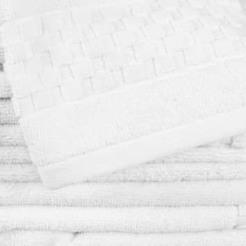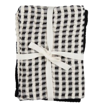1/ Ayora – Torchons en coton biologique nid d’abeille noir et blanc 50×70 (x2) 2/ Newark – Nappe en gaze de coton blanche avec bourdon noir 150×250