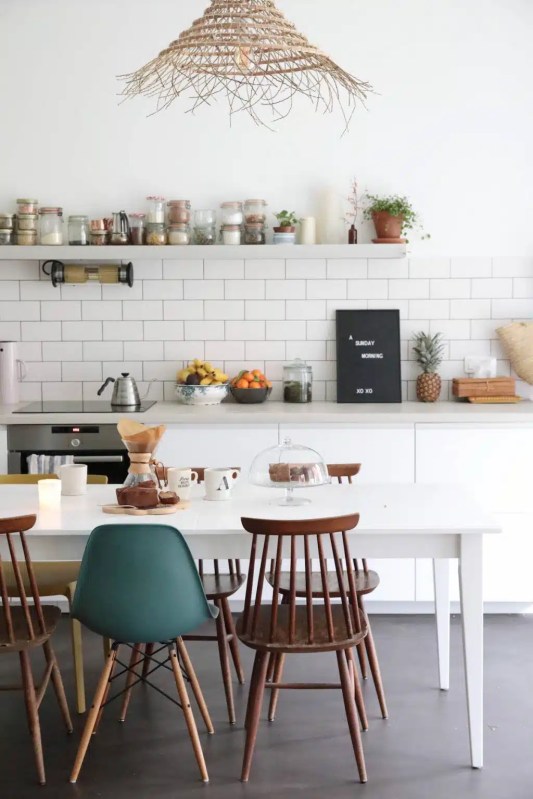 Pour garantir une harmonie dans votre salle à manger optez pour des chaises de modèles différents mais dans la même teinte. Jouez sur des camaïeux de blanc, de vert, de bleu, ou même tout simplement de bois ! Ce qui fera l’originalité ici ce sont les différences de styles et de matières.