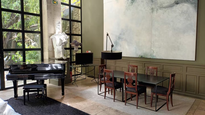 Ayant été le foyer d’un cardinal au 14e siècle, cette maison ancienne à Avignon, tendrement nommée « Le Complot », porte en elle 700 ans d’histoire. Nichée au cœur de la ville historique, à deux pas des remparts médiévaux et du Palais des Papes, elle évoque un charme intemporel. Décorée avec soin par le designer Gilles Jauffret, cette grande maison de 230m2 a su préserver son allure classique tout en intégrant des éléments contemporains, comme l’immense fenêtre verrière qui illumine le vaste salon. Dans cette pièce spacieuse de 70m2, la cuisine ouverte se dévoile discrètement derrière un bar, créant un espace accueillant et chaleureux.