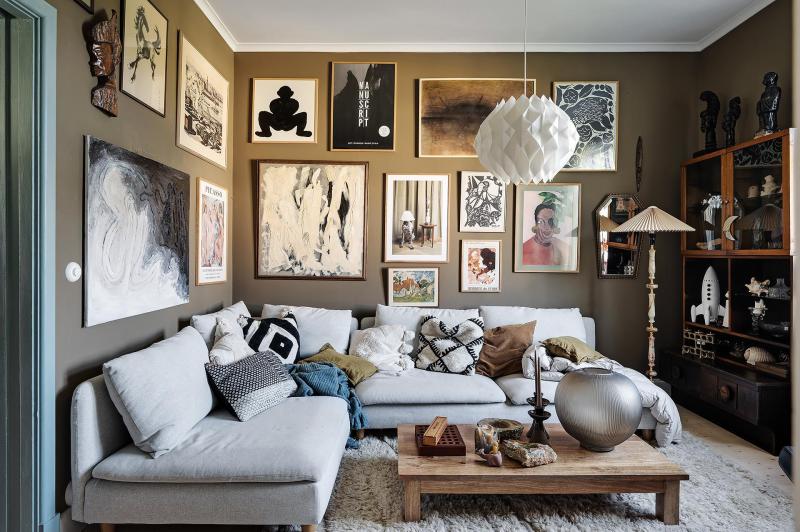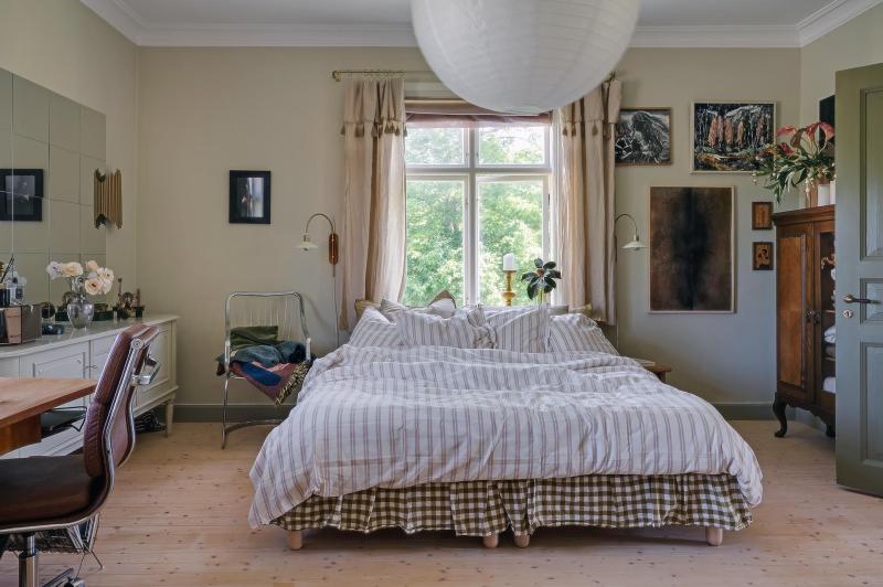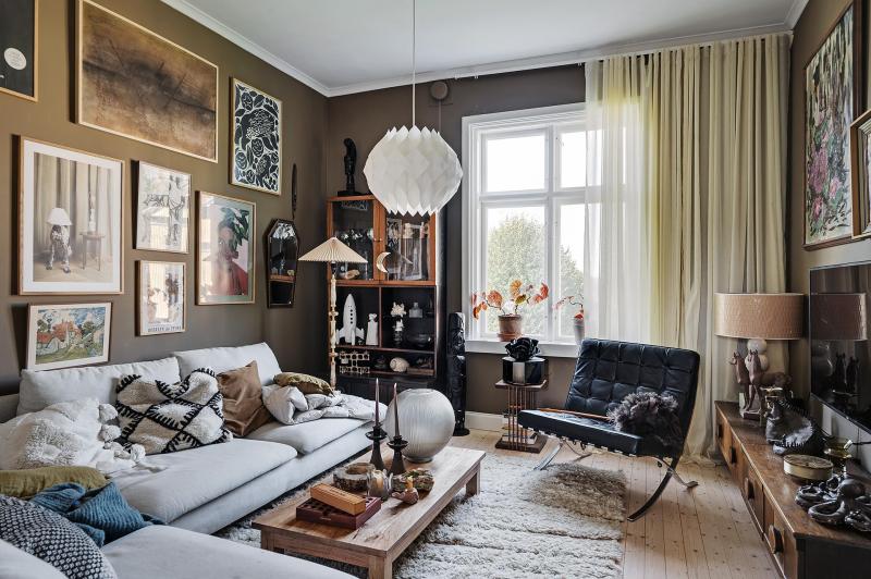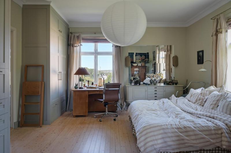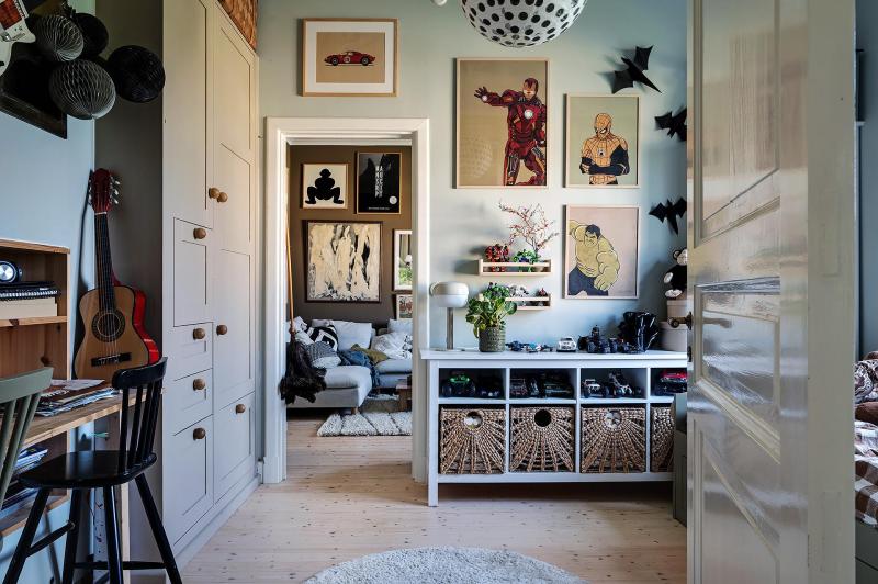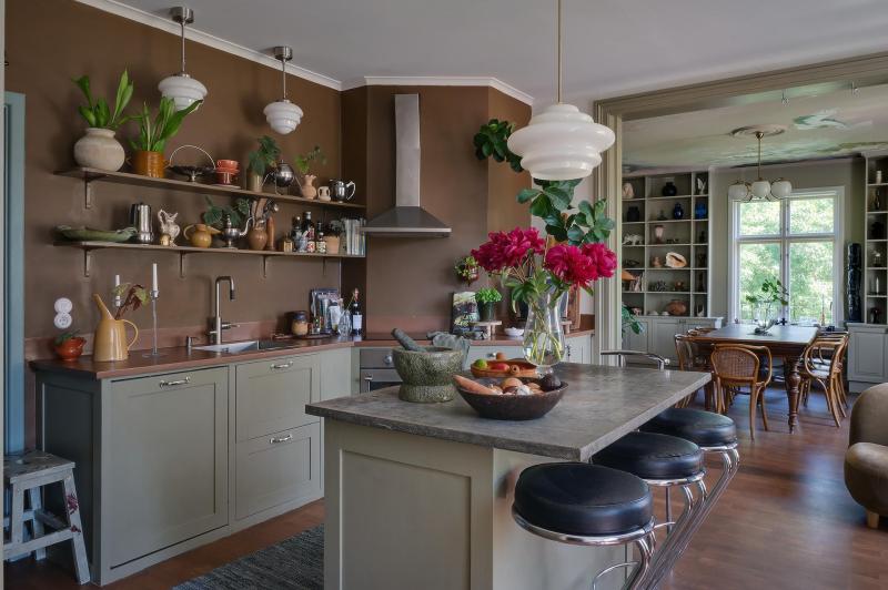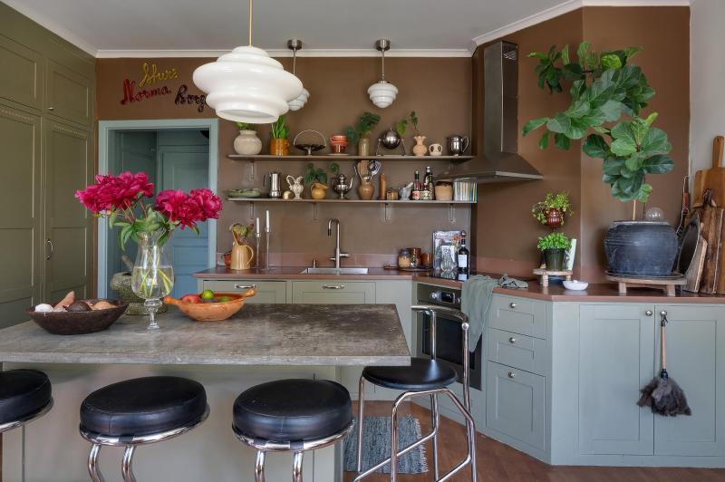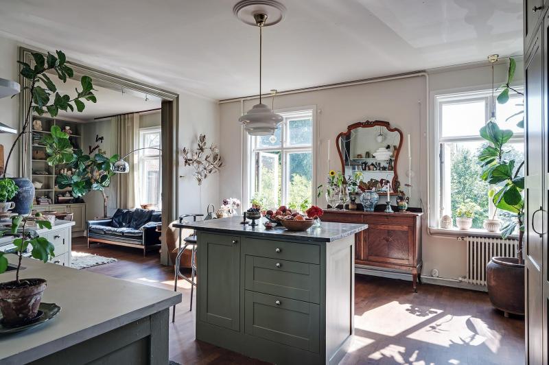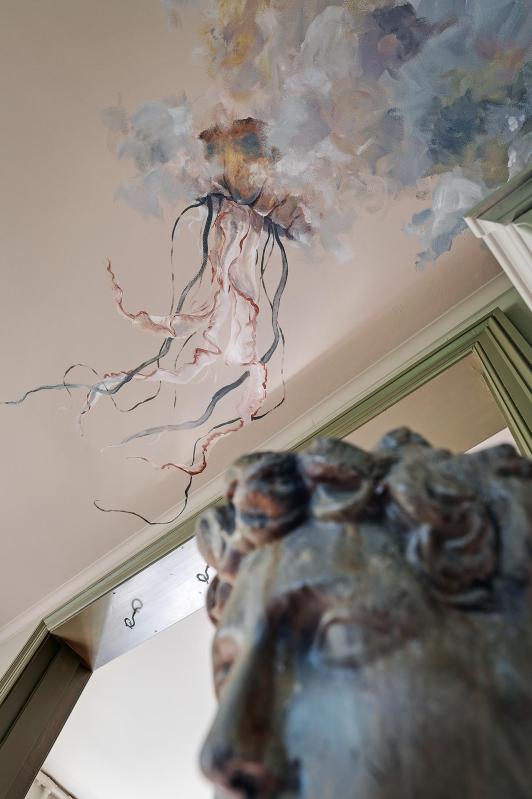 Pénétrer dans cet appartement, c’est ressentir un coup de cœur immédiat face à sa décoration empreinte de charme. Les hautes fenêtres et les éléments en fonte, ainsi que la vue apaisante sur la nature, font de cet espace au plafond atypique, délicatement peint à la main dans la salle à manger, un lieu authentique et unique. Dans cette pièce, on peut presque se sentir transporté dans un cabinet de curiosités, entouré d’animaux et de plantes qui dansent au-dessus de nos têtes. Oiseaux, feuilles et fleurs, sans oublier les méduses, créent une ambiance décorative singulière, où des couleurs profondes et relaxantes viennent apporter réconfort et sérénité.