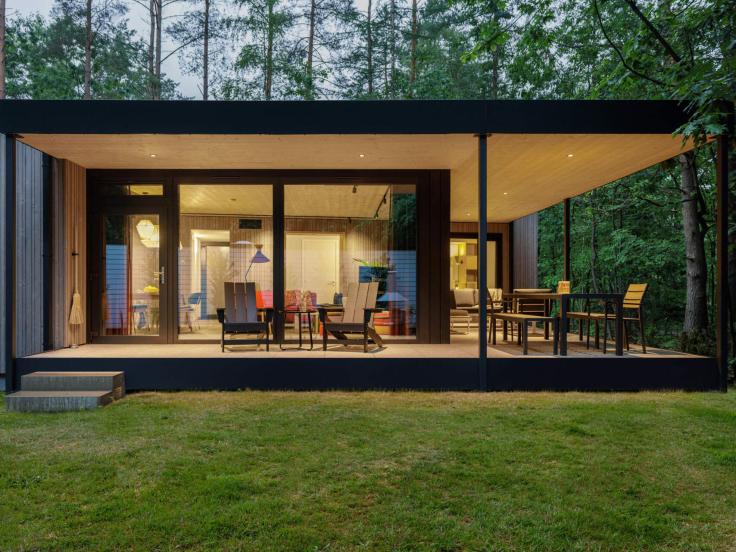 Bien qu’il s’agisse d’une maison destinée aux vacances, elle n’en ait pas moins parfaitement pensée pour une vie quotidienne, sans faire l’impasse sur l’esthétique et le confort. Construite à partir de deux modules préfabriqués, la maison peut s’installer sur site en moins de deux semaines. Elle possède une large terrasse à l’extérieur, bien abritée pour profiter de son environnement forestier le plus longtemps possible.